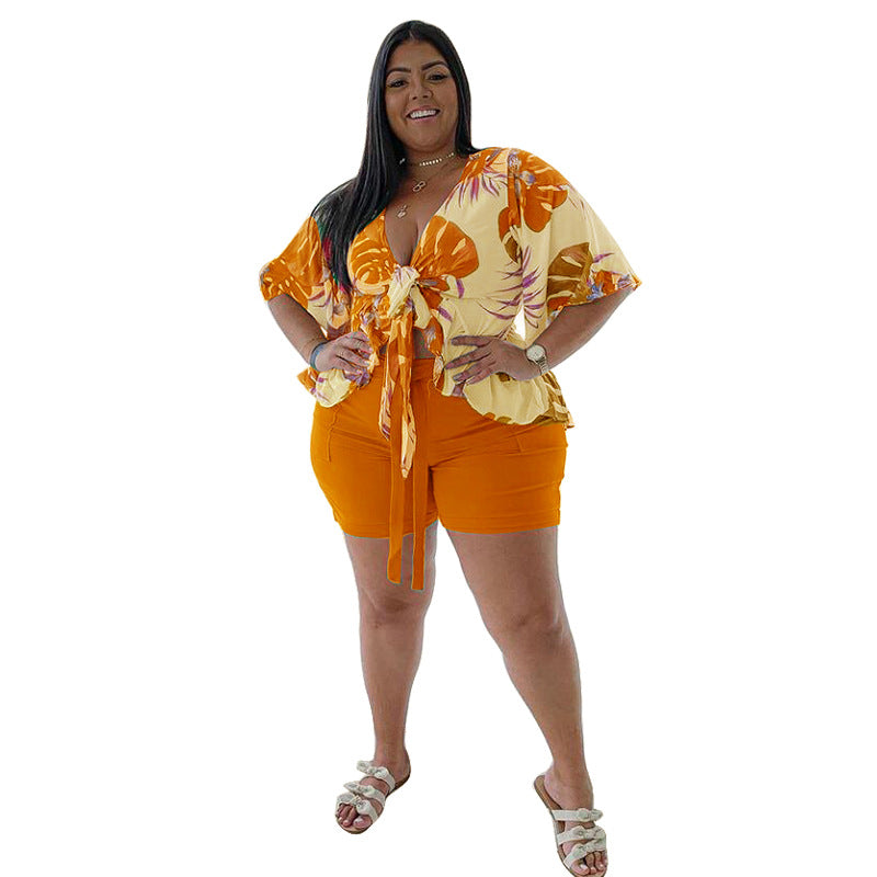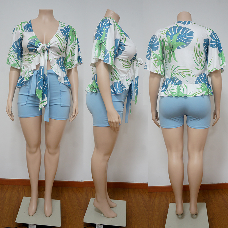 Plus Size Spring Autumn Two-Piece Suit Printed Casual T-shirt Shorts Set