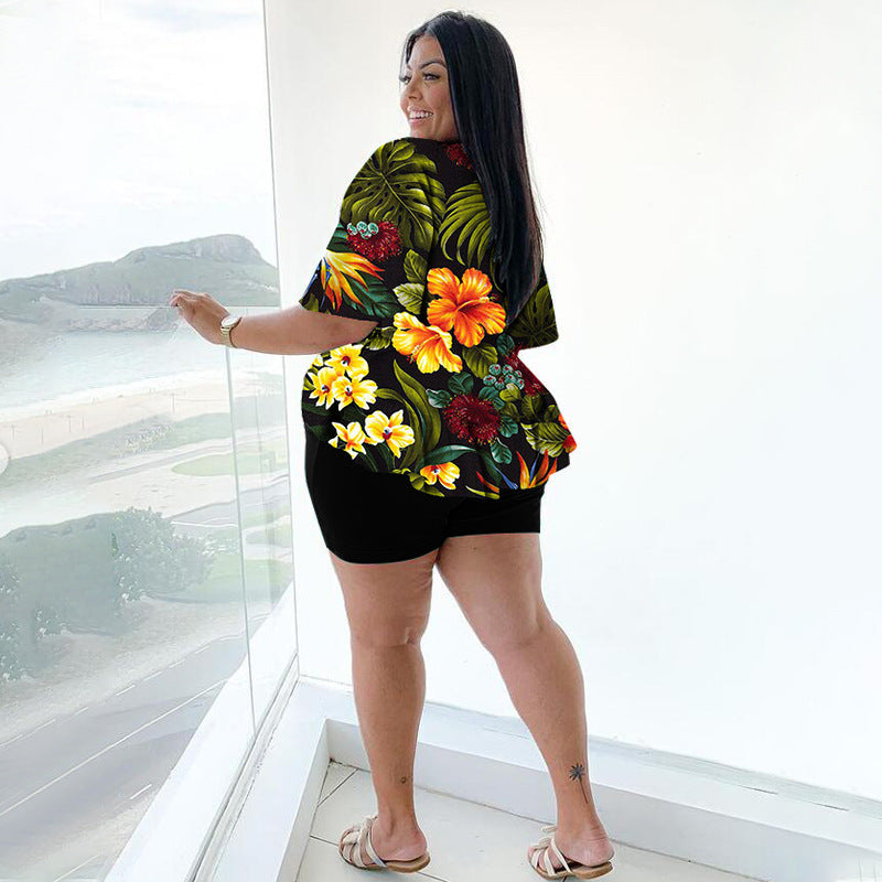 Plus Size Spring Autumn Women Clothing Two-Piece Suit Printing Casual T-shirt Shorts Set