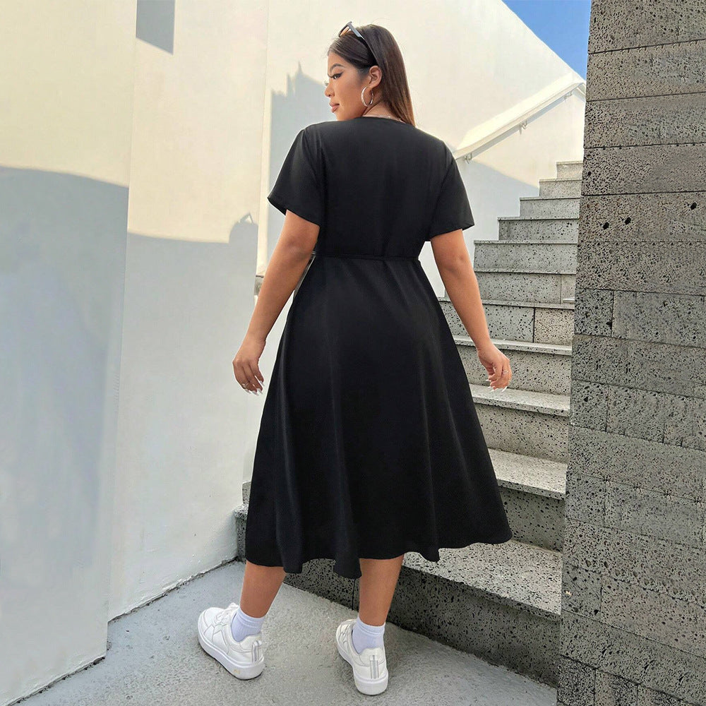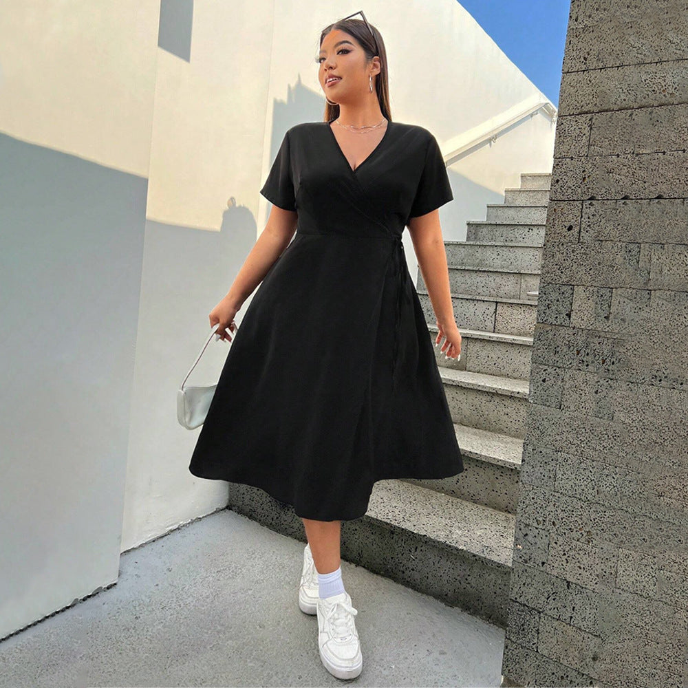 Plus Size Spring V Neck Slit Midi Dress Solid Color Slim Fit Office Short Sleeve Dress