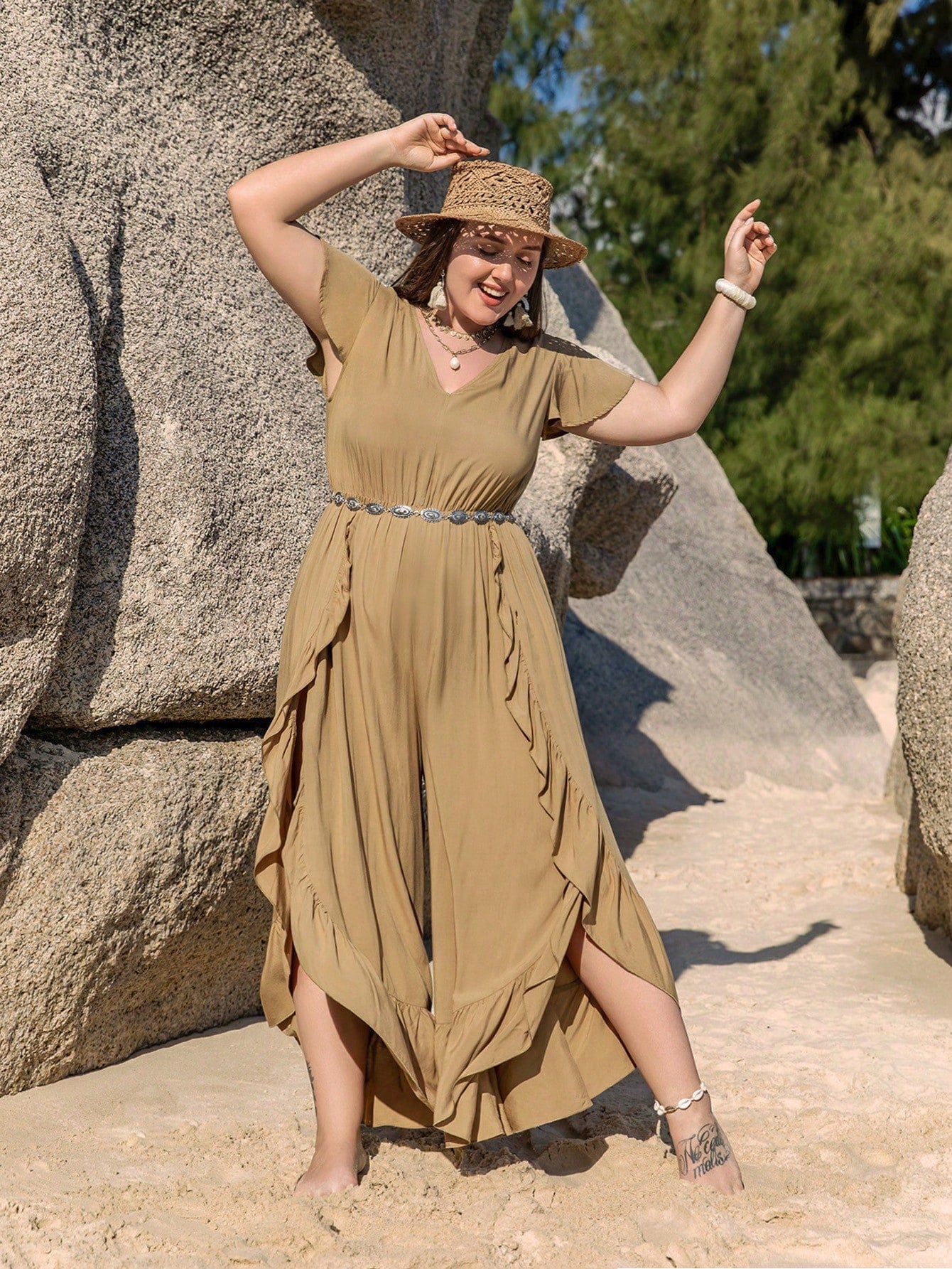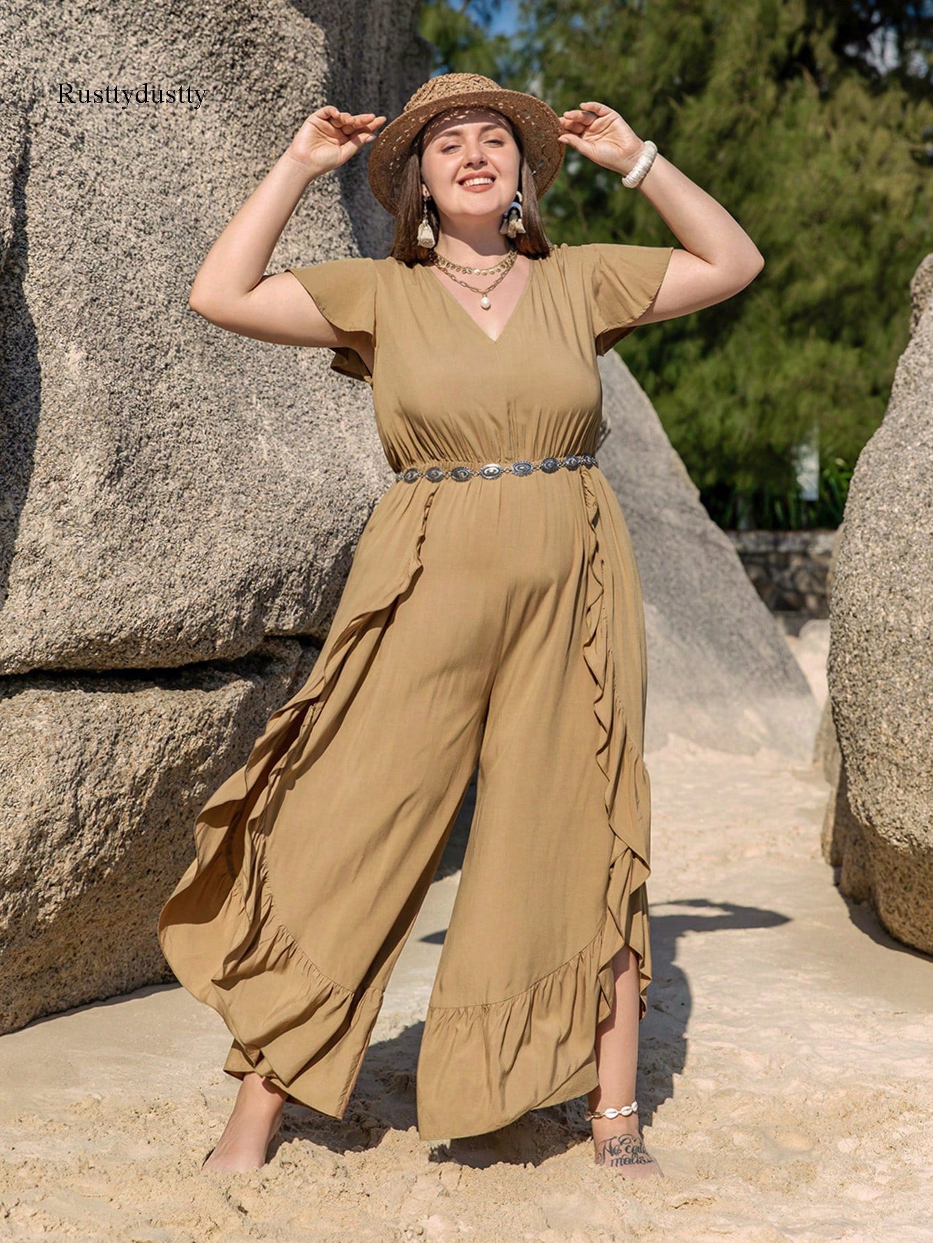 Plus Size Summer Brown Waist Short Sleeve Beach Jumpsuit Fish Mouth Pants No belt