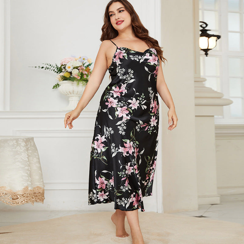 Plus Size Summer Ice Silk Pajamas Casual Pajamas Imitation Silk Sexy Print Slip Nightdress