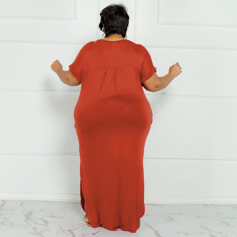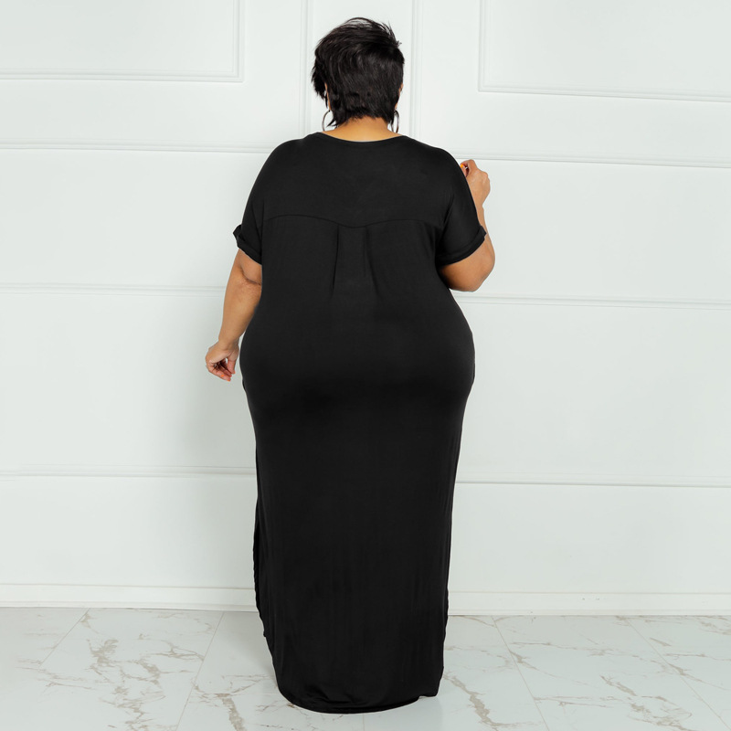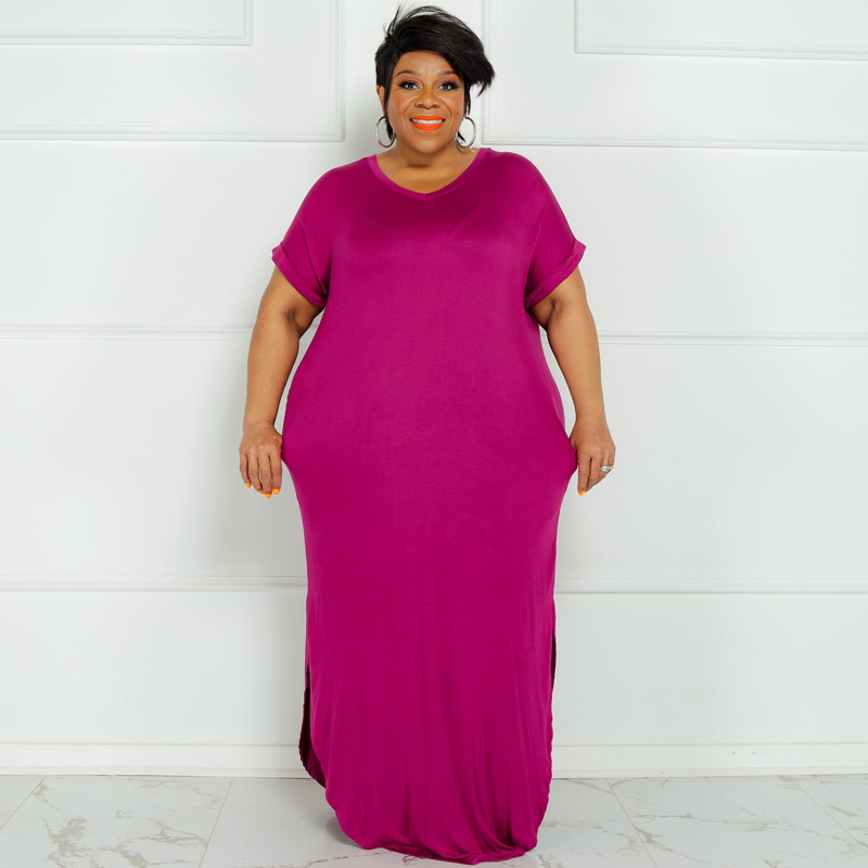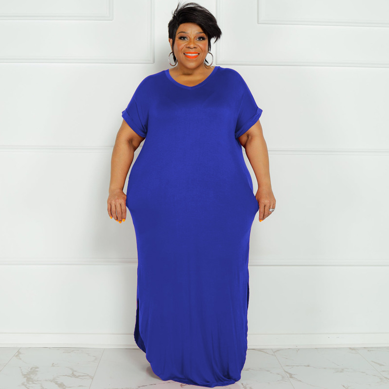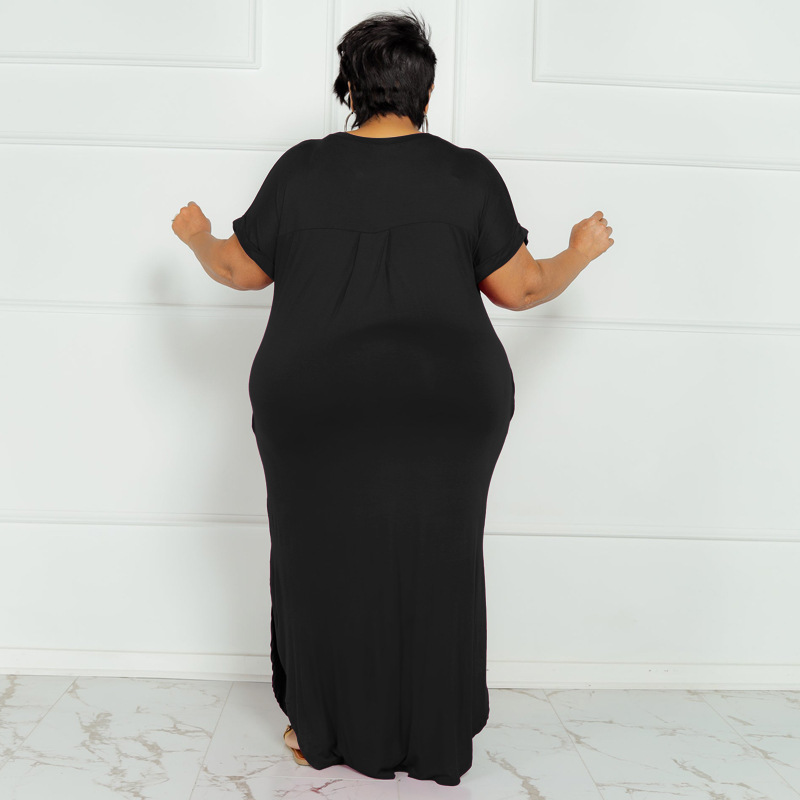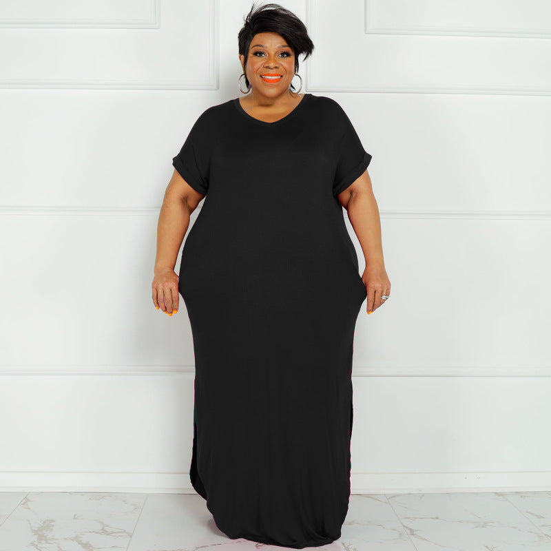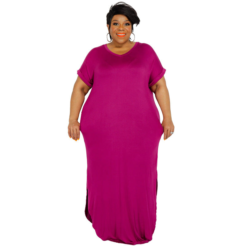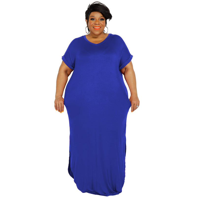 Plus Size Summer New Solid Color round Neck Dress Slit Hemline at Hem Loose Skirt