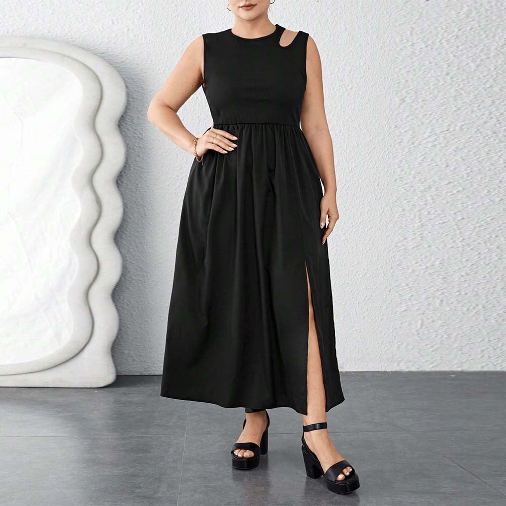 Plus Size Summer Round Neck Waist Trimming Split Maxi Dress Vest Sleeveless Stitching Dress