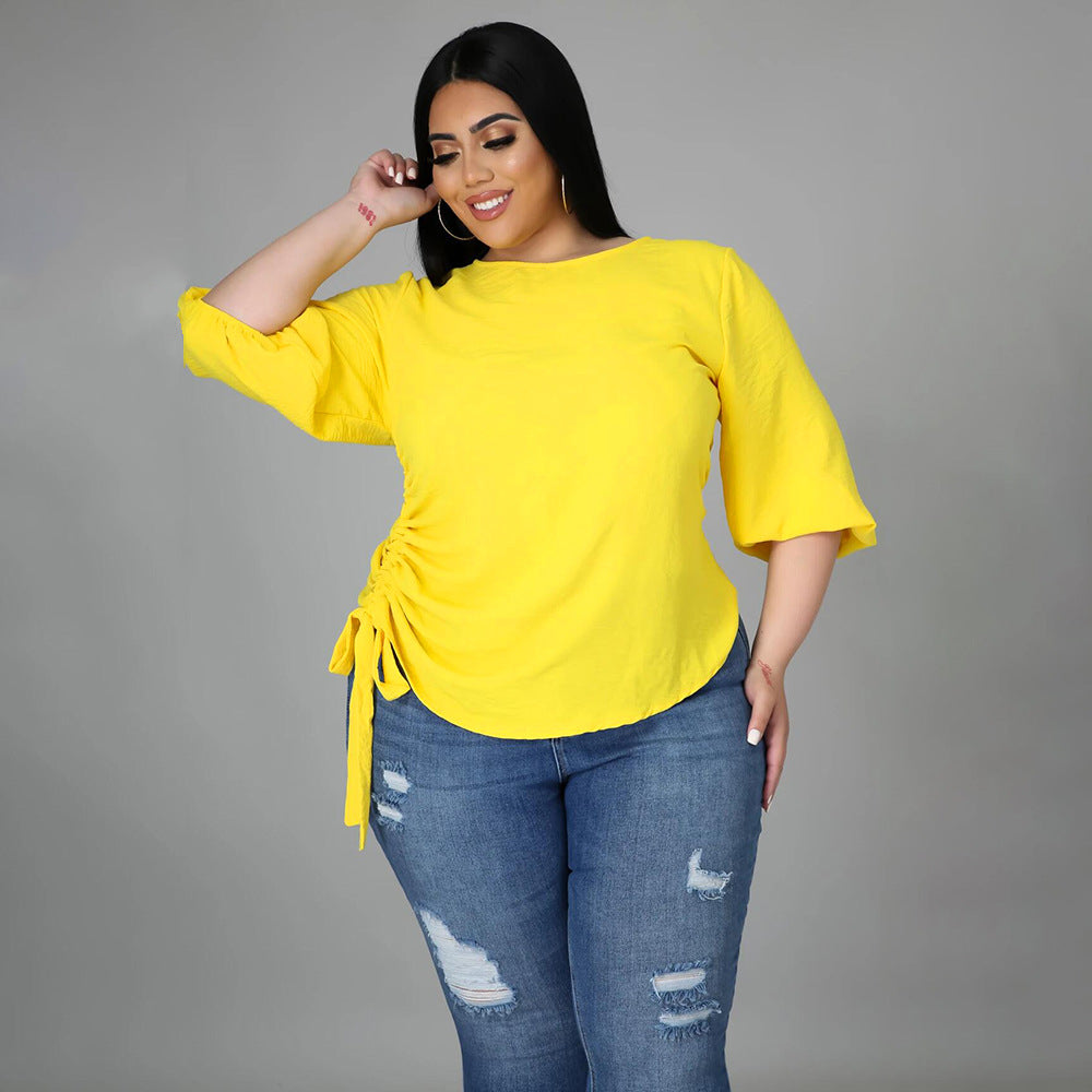Plus Size Summer Solid Color round Neck Women Woman T shirt Irregular Asymmetric Medium Long Sleeve Top