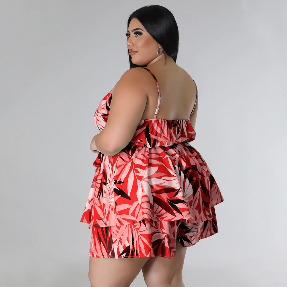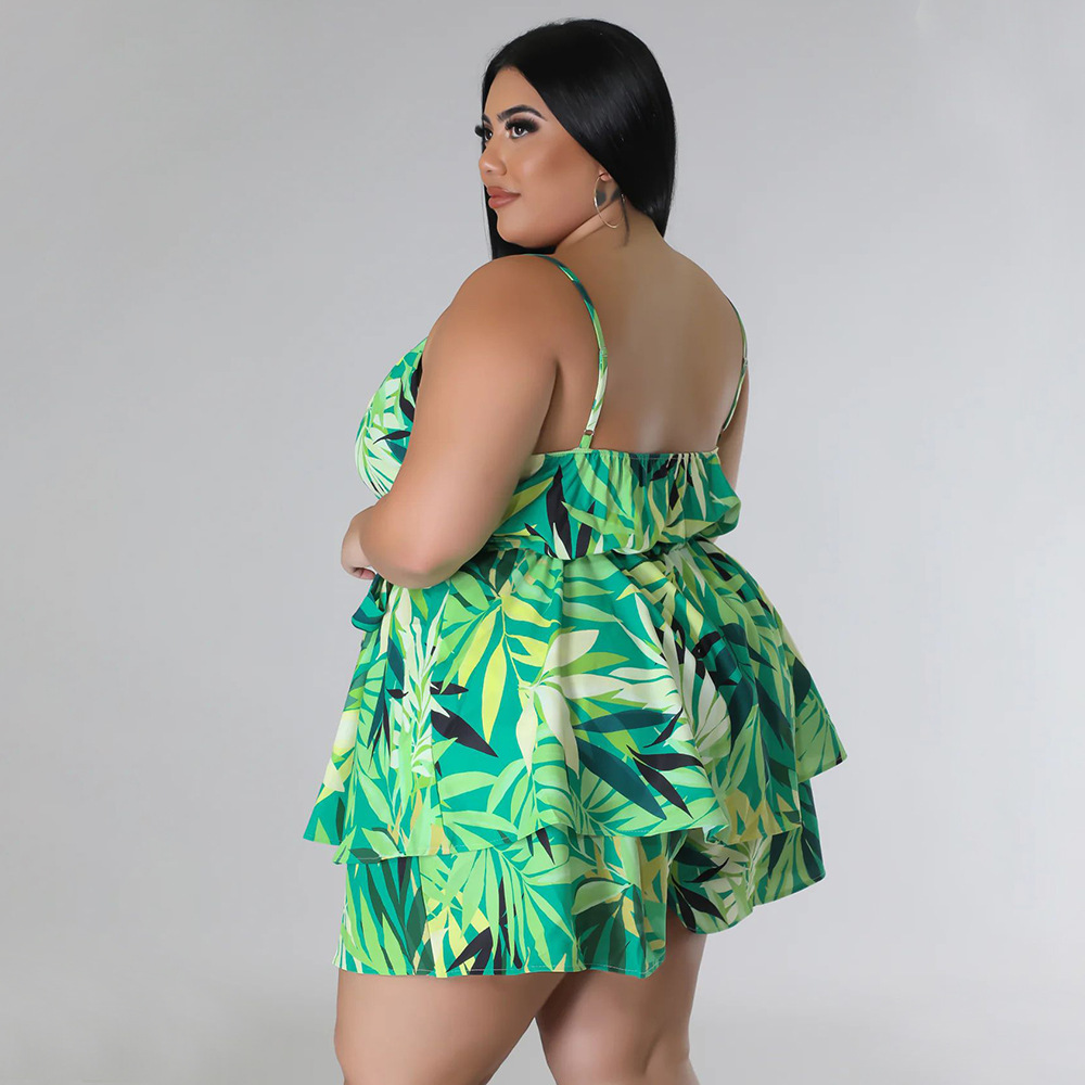 Plus Size Summer V Neck Printed Strap Lace Up Cinched Casual Two Piece Suit Women