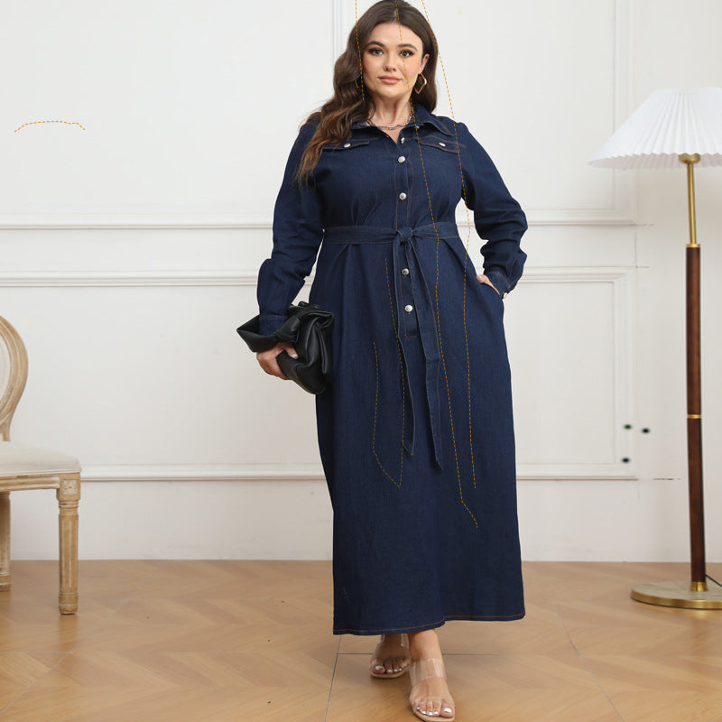 Plus Size Winter Women Clothing Collar Cardigan Washed Denim Dress