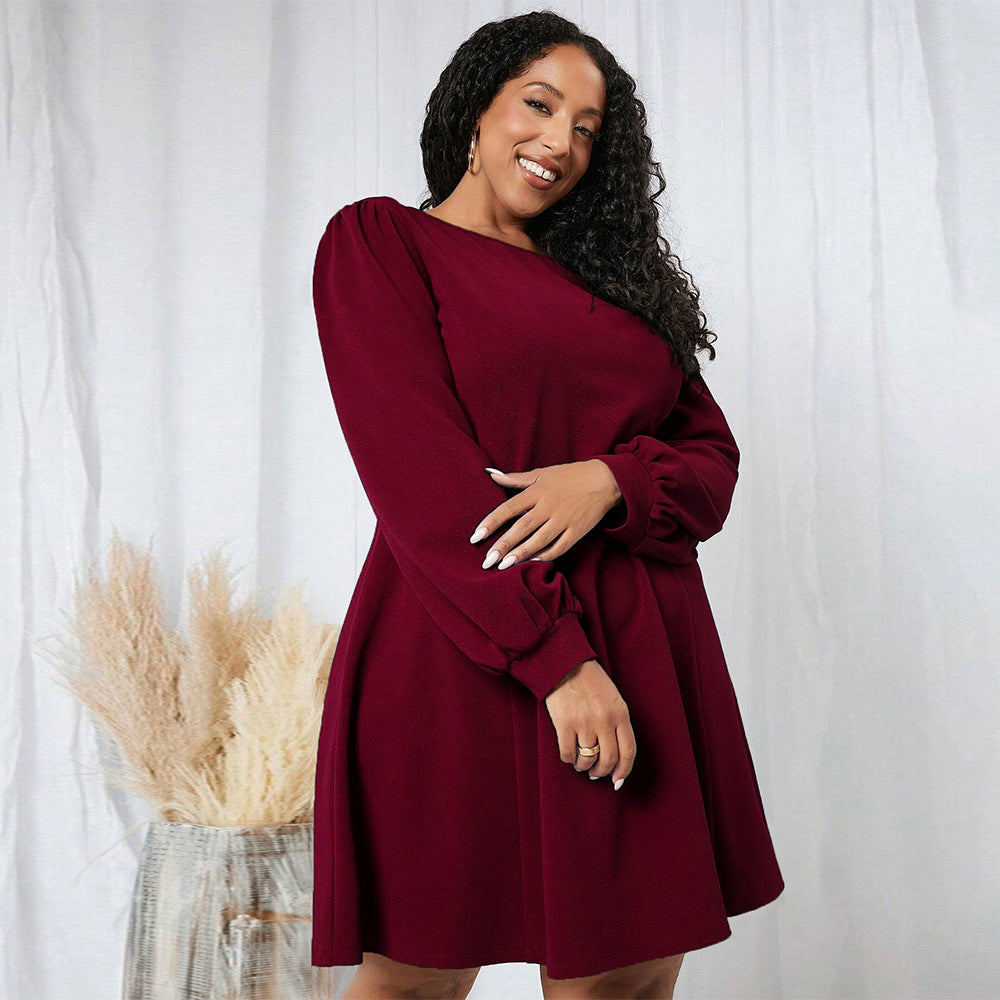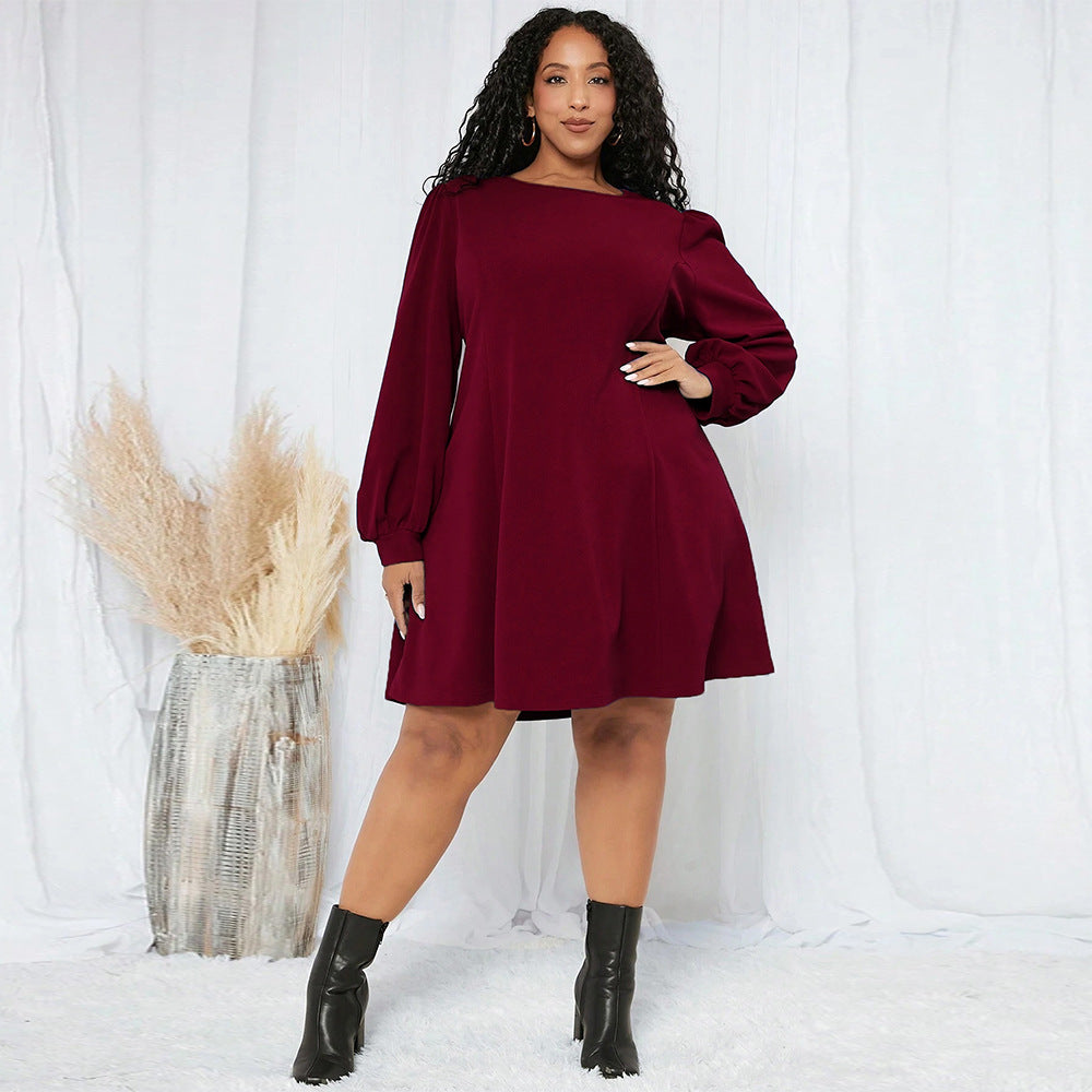 Plus Size Women Clothes Autumn Winter Tight Waist Large Round Neck Long Sleeve Dress