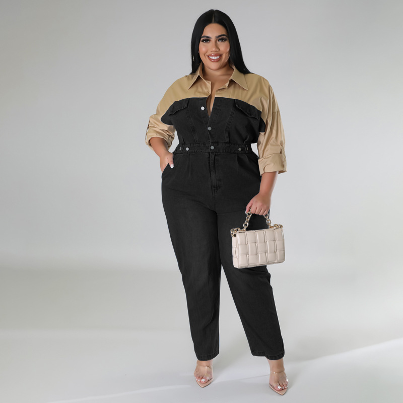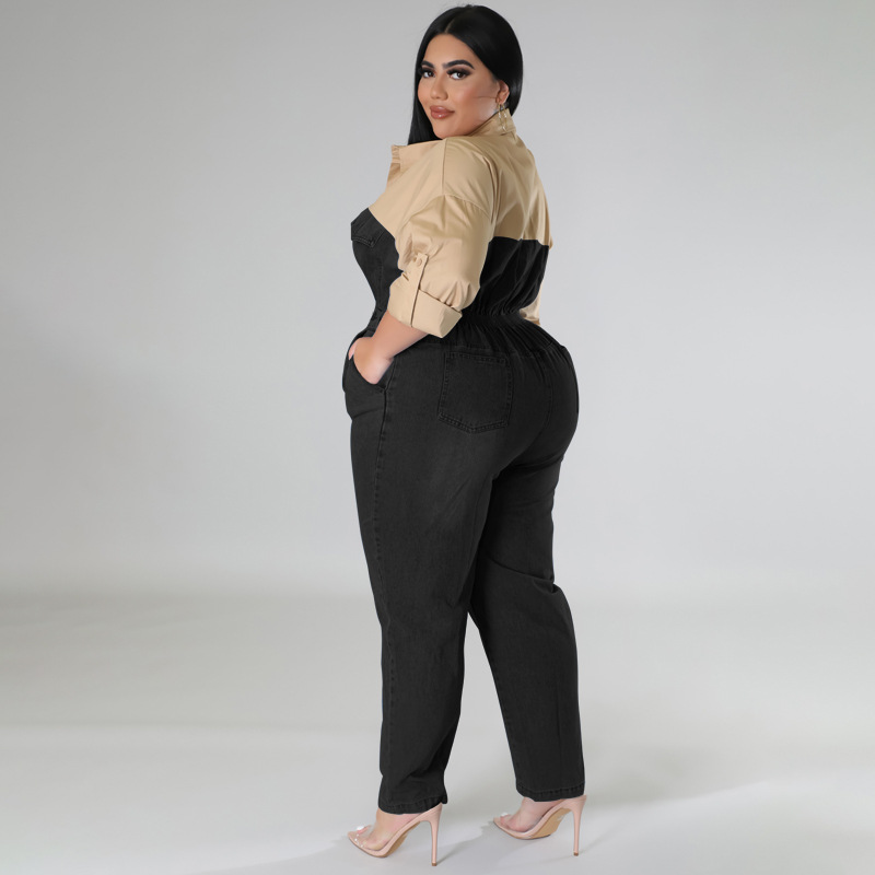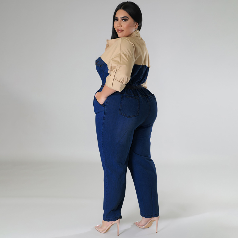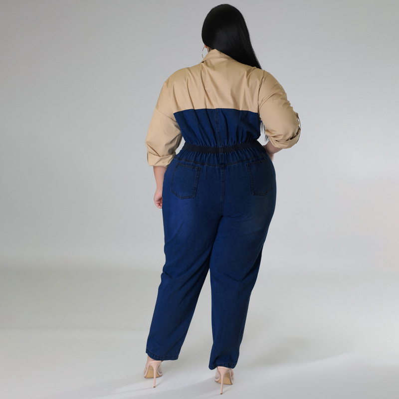 Plus Size Women Clothes Denim Contrast Color Jumpsuit