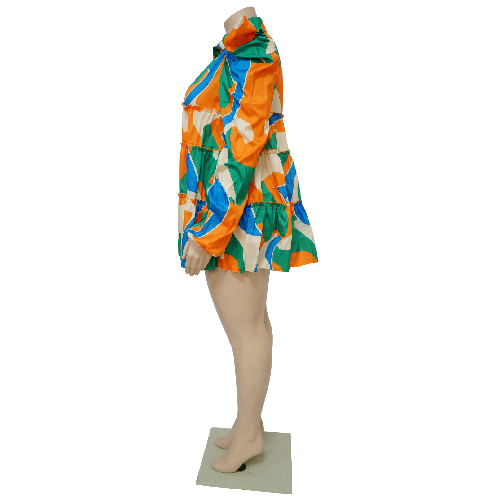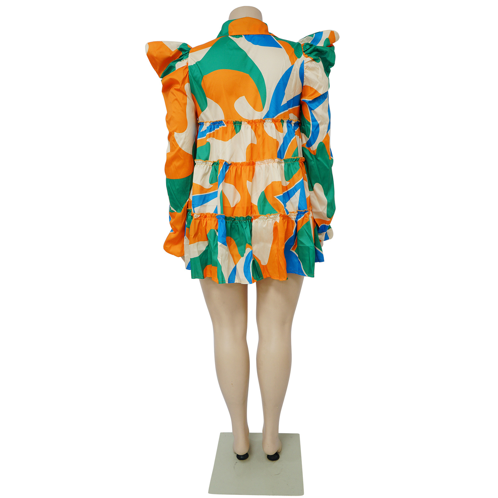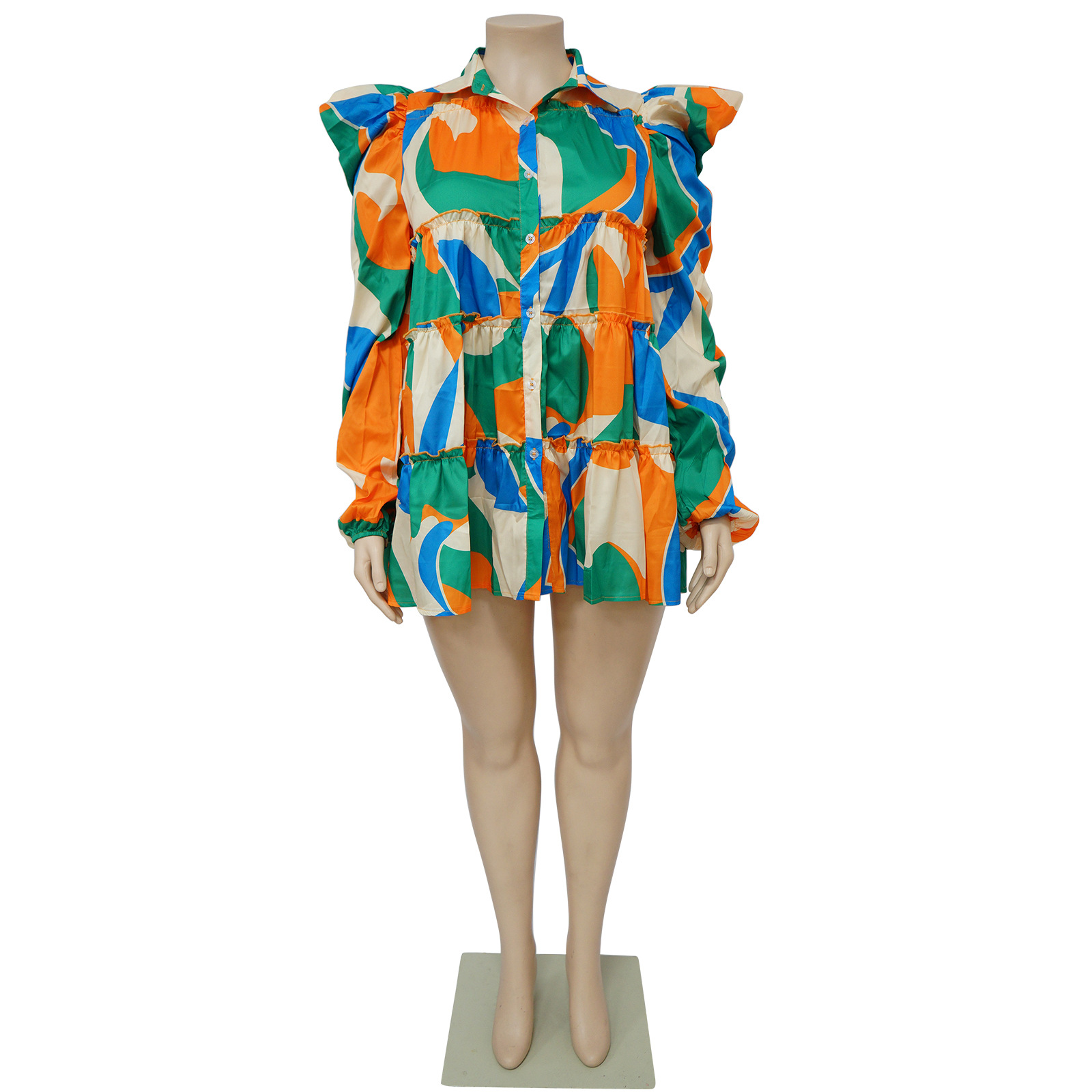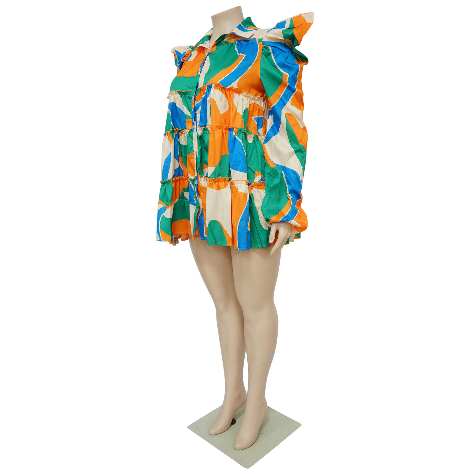 Plus Size Women Clothes Printed Ruffled Button Dress Shirt Dress