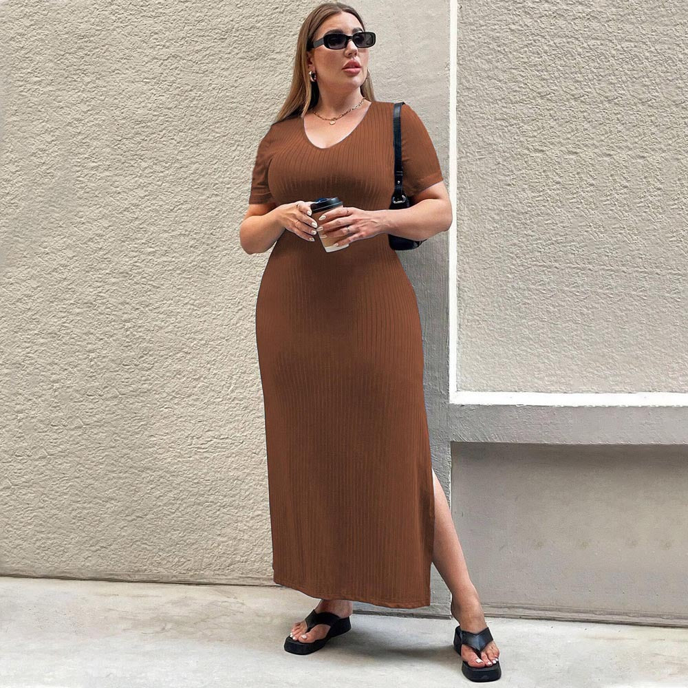 Plus Size Women Clothes Waist Controlled Split Short Sleeve Dress Sheath Dress