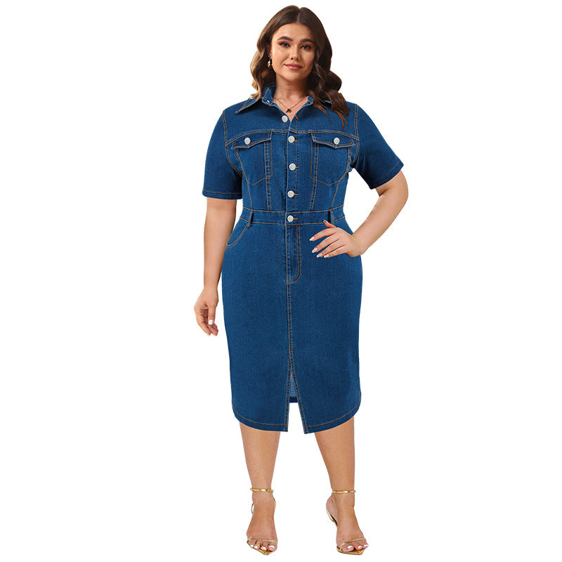 Plus Size Women Clothing Denim Collared Short Sleeve Split Mid Length Dress