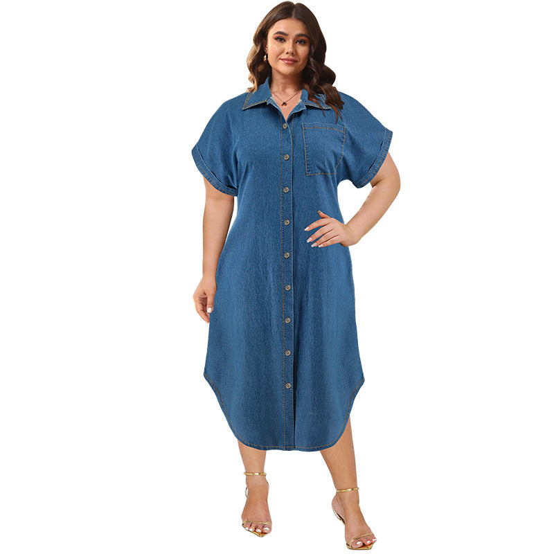 Plus Size Women Clothing Denim Short Sleeved Button Mid Length Width Dress