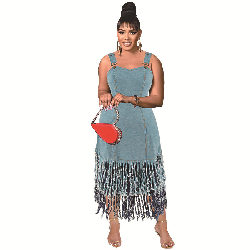 Plus Size Women Clothing Denim Sleeveless Sling Tassel Stitching Dress