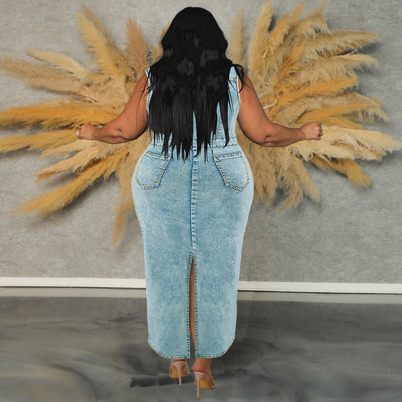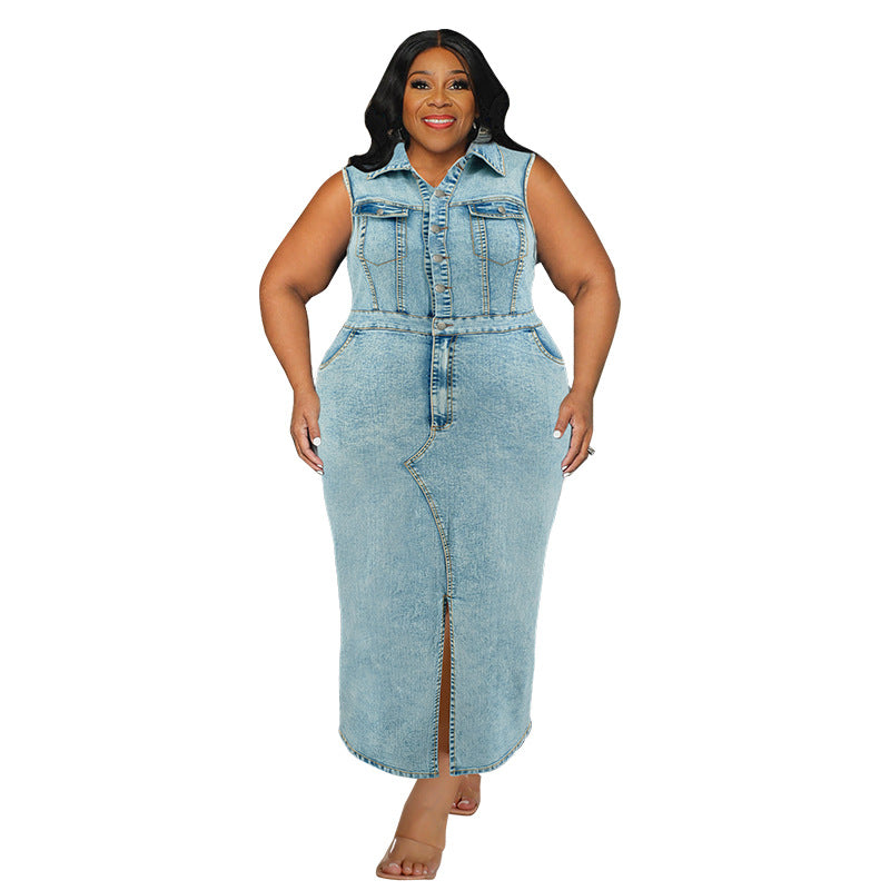 Plus Size Women Clothing Denim Sleeveless Split Collared Dress