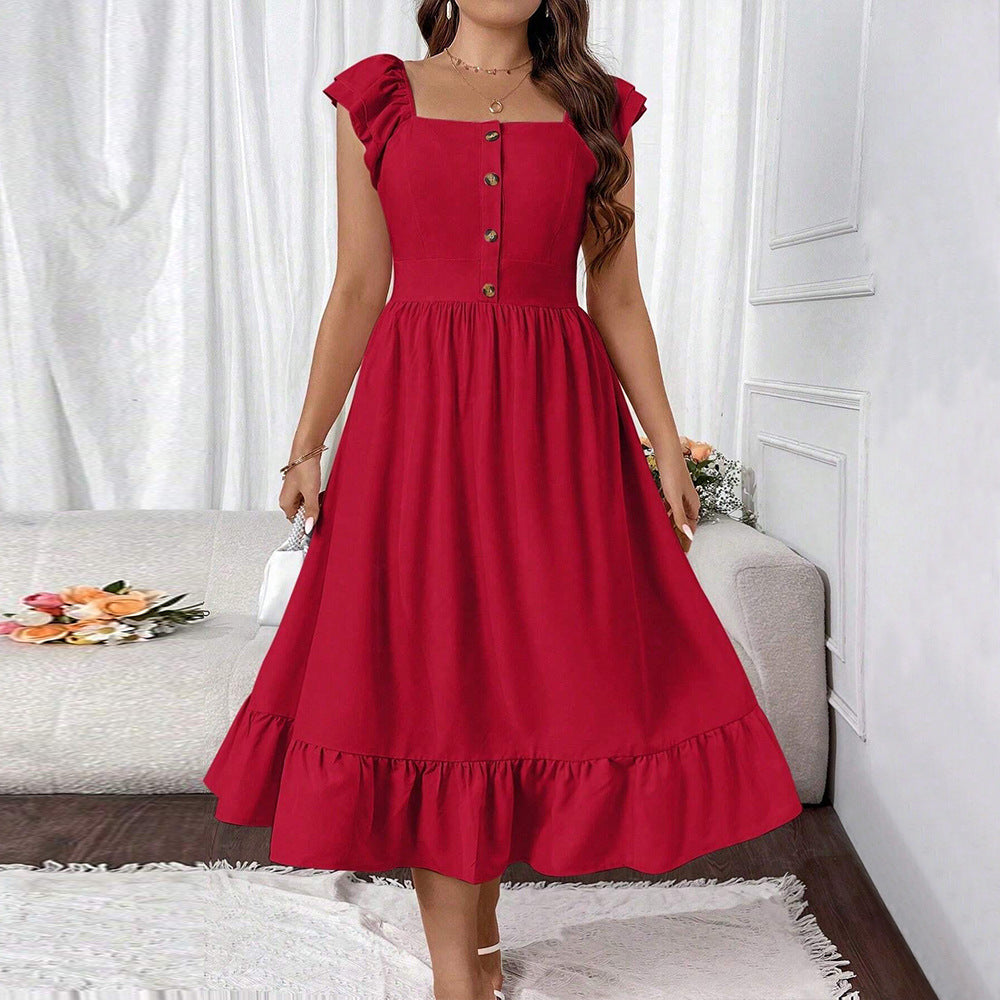 Plus Size Women Clothing Square Collar Flying Sleeve Dress Summer Vacation Red Dress Children