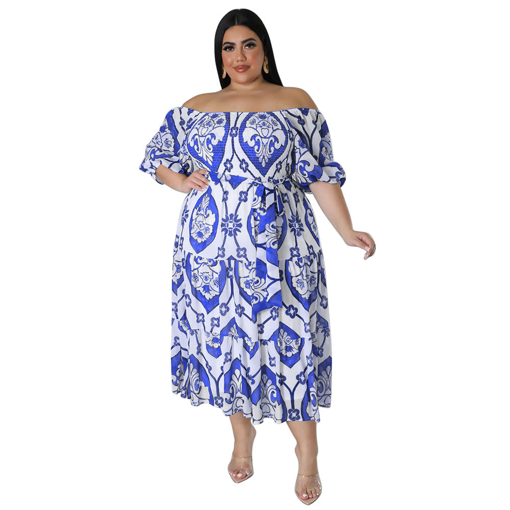 Plus Size Women Clothing Summer Print Short Sleeve Lace Up Folding High Waist Dress