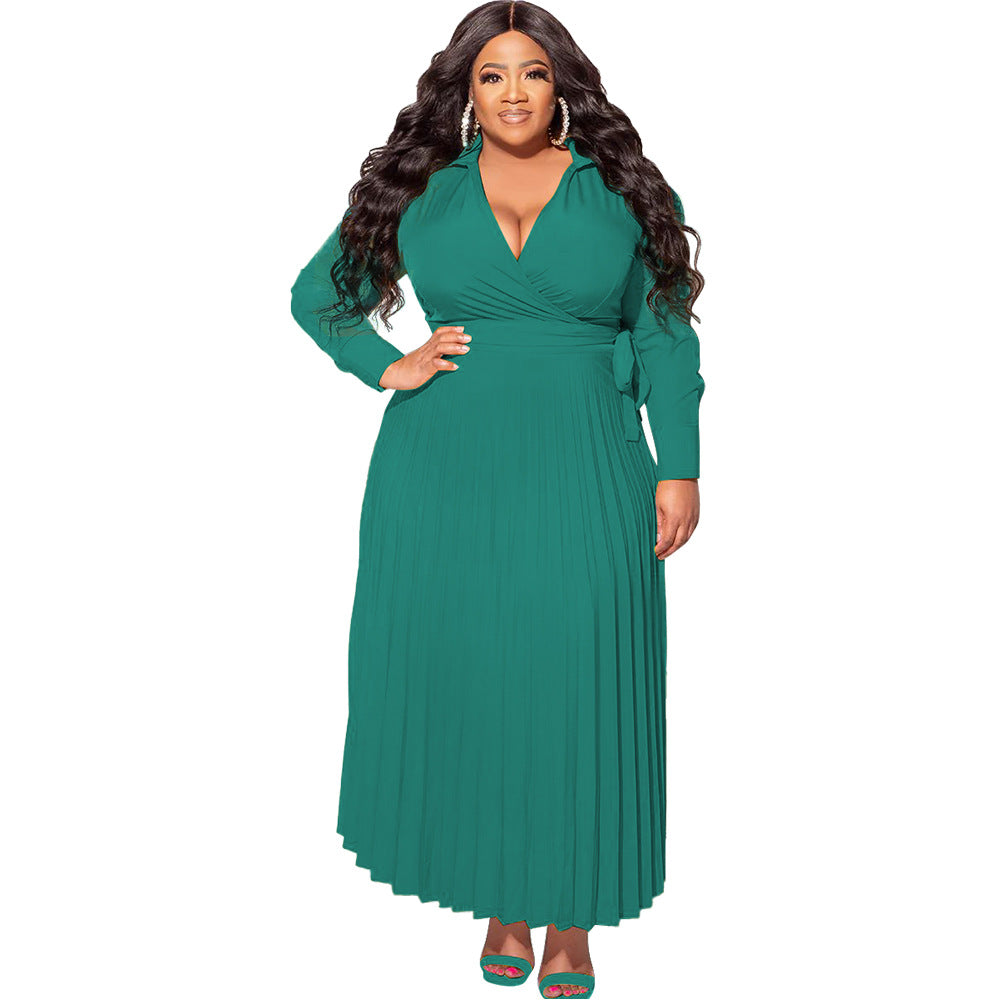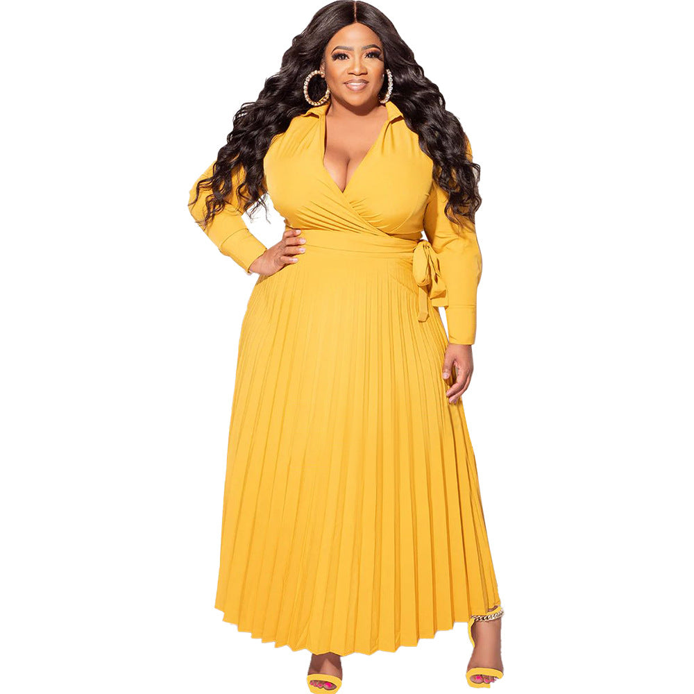 Plus Size Women Clothing V neck Lace up Long Sleeve Pleated Decoration Body Dress