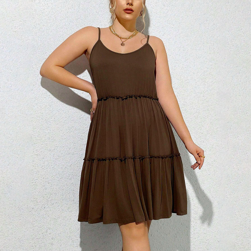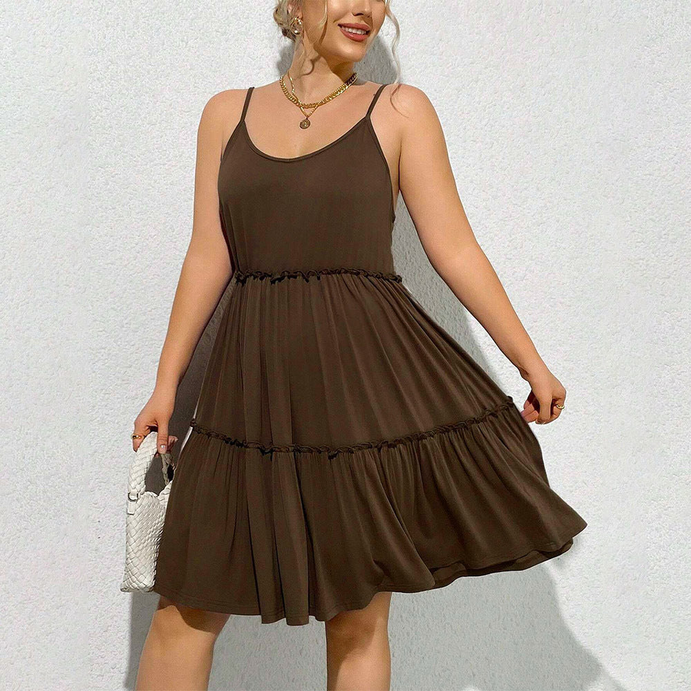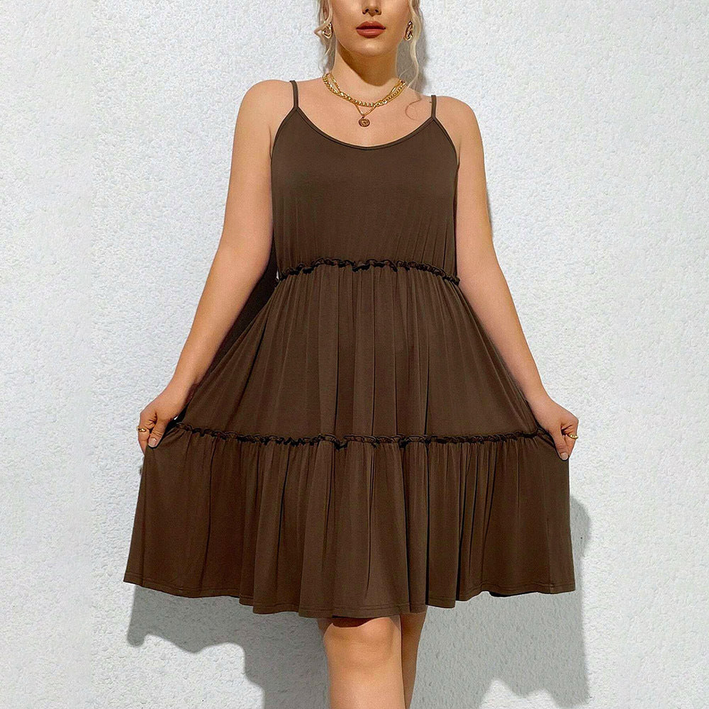 Plus Size Women Elegant U Neck Dress Summer High Waist Pullover Solid Color Midi Dress