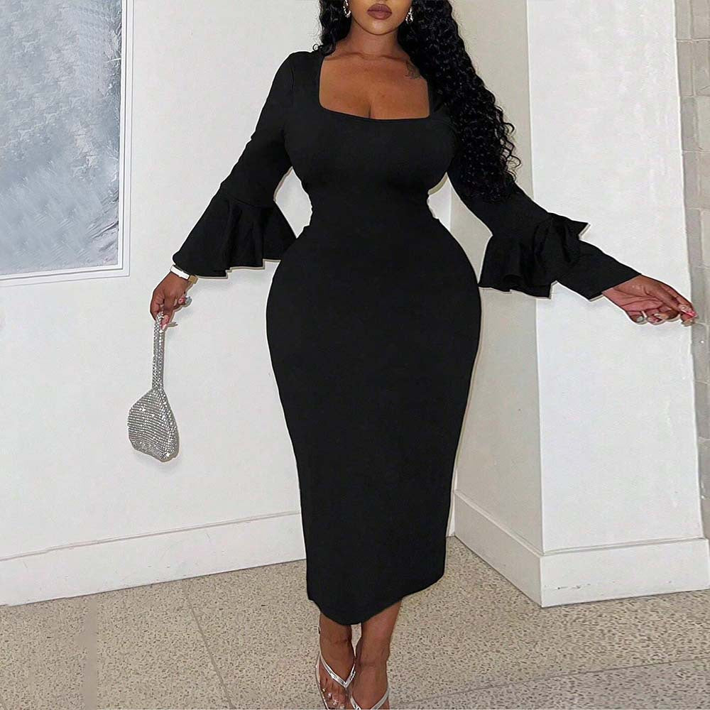 Plus Size Women Sexy Elegant Dress Autumn Winter Square Collar Ruffle Sleeve Slim Midi Dress