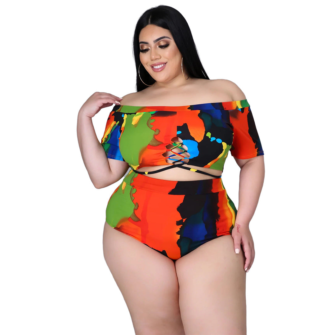 Plus Size Women Sexy Print Strap off-Shoulder Swimsuit Suit