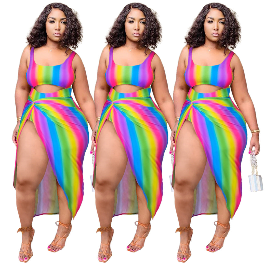 Plus Size Women Sexy Rainbow Striped Hollow Out Cutout One Swimsuit Dress Two-Piece Set