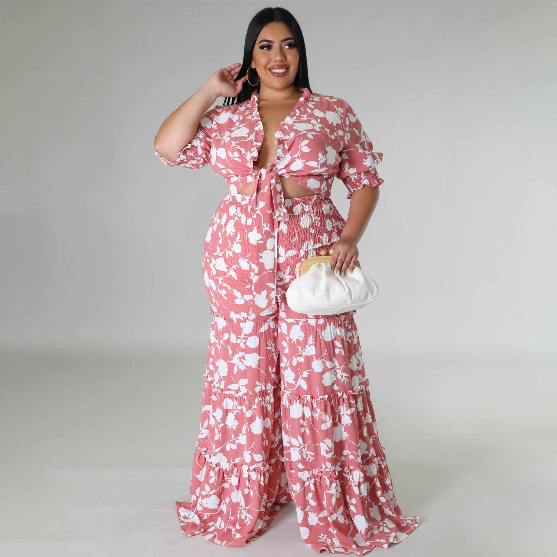 Plus Size Women Strap Printing Two Piece Suit Wide Leg Pants Summer