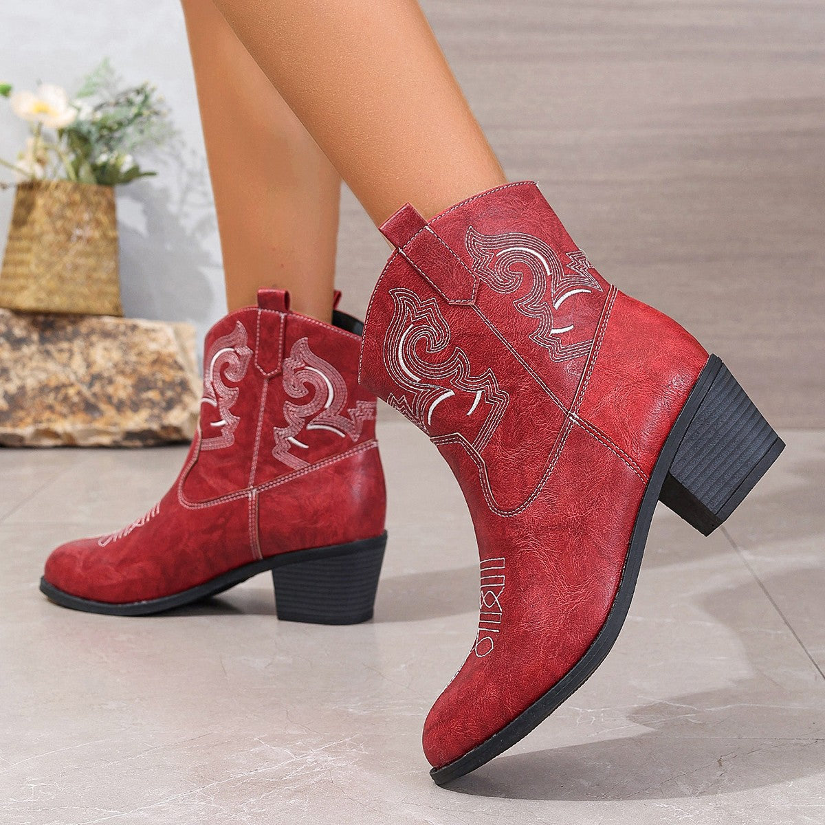 Pointed Embroidered Solid Color Chunky Heel Leather Boots Women Short Solid Color Slip on Knight Martin Boots