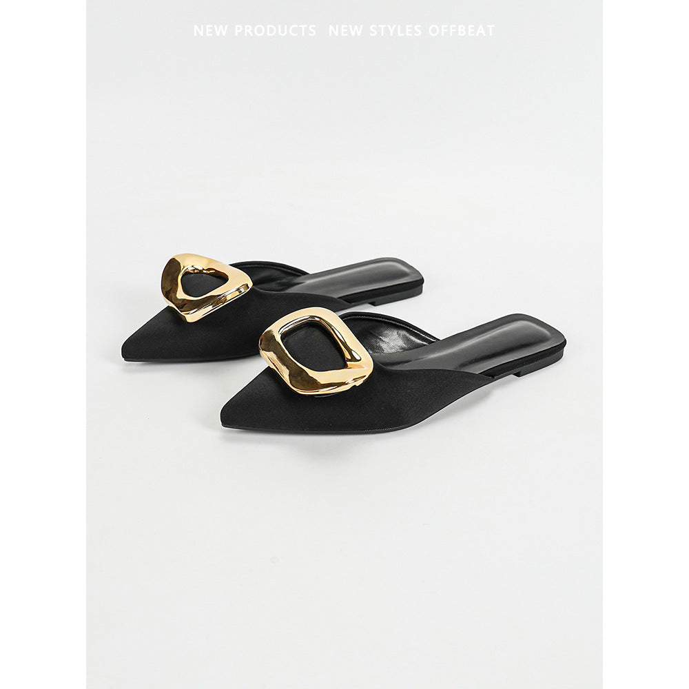 Pointed Flat Shoes Women Niche Retro Metal round Buckle Slip on Closed Toe Slippers Women Outdoor Sandals
