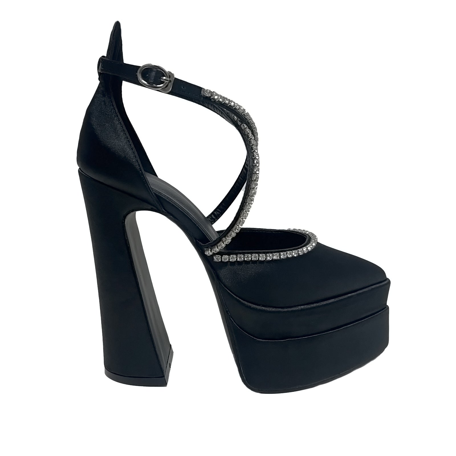 Pointed Toe Rhinestone Chunky Heel Satin Wedding Cocktail 15cm Double Waterproof Platform Women Shoes Heels