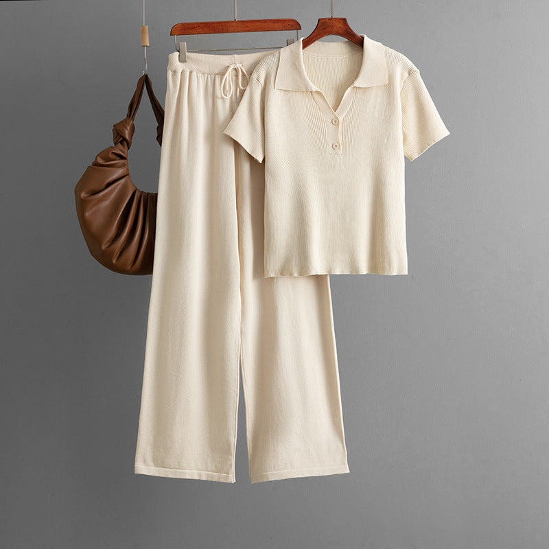 Polo Collar Ice Silk Knitted Women Summer Elegant Button T shirt Casual Pants Two Piece Set