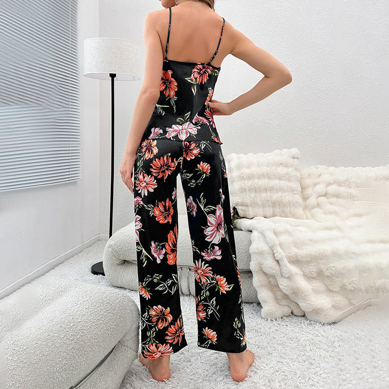 Printing Backless Slip Dress Sexy Casual Pajamas Set Women Simple Artificial Silk Home Wear