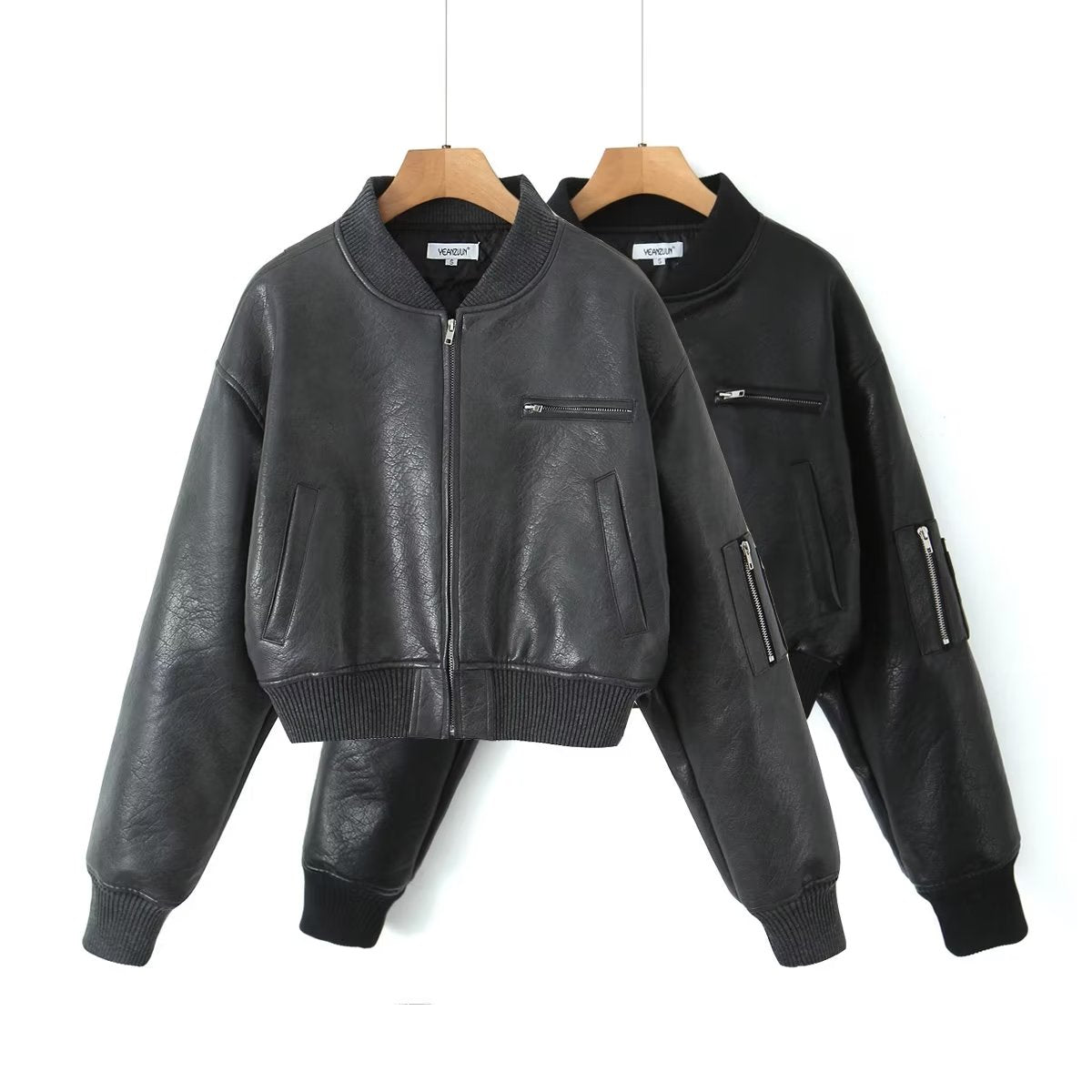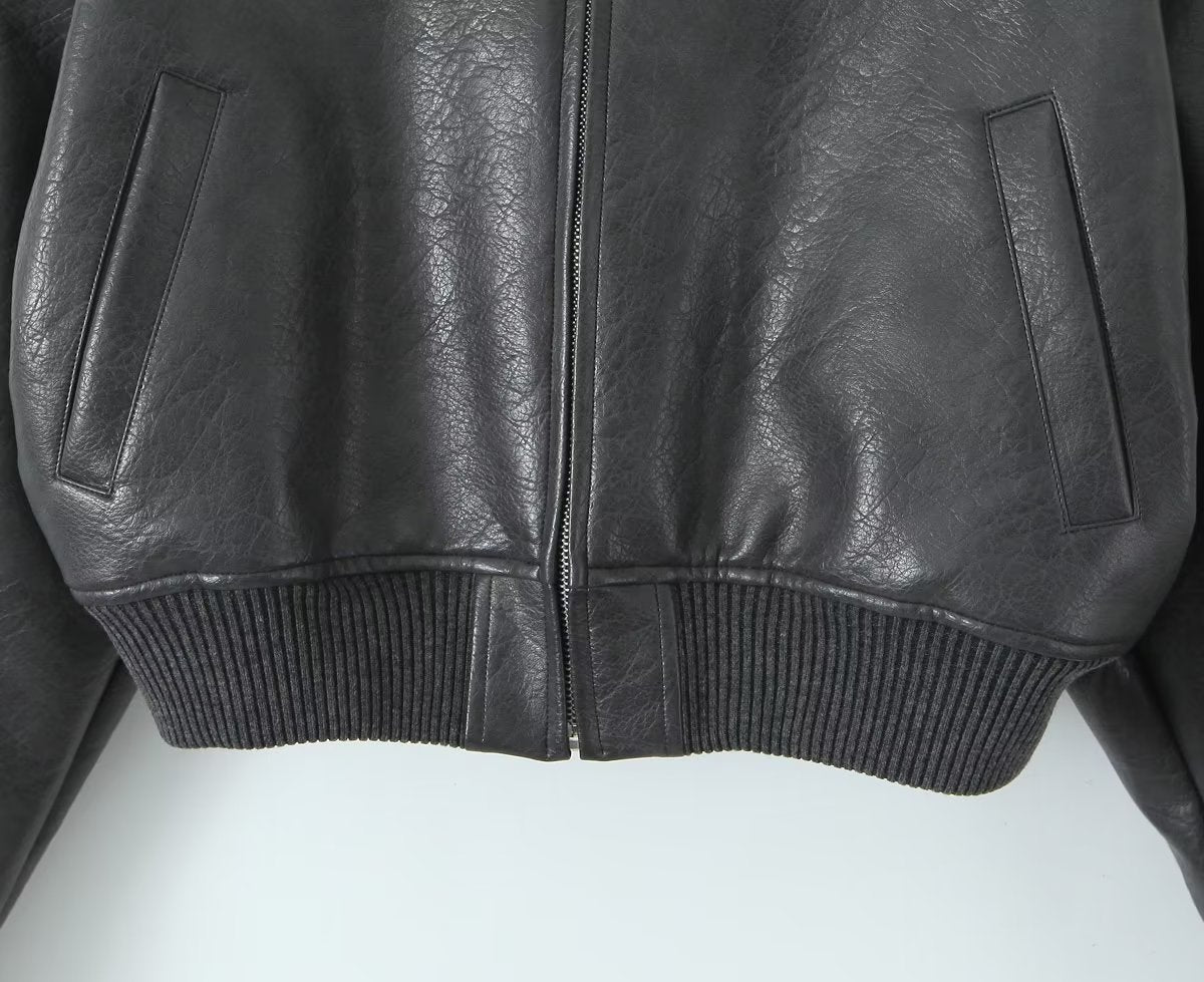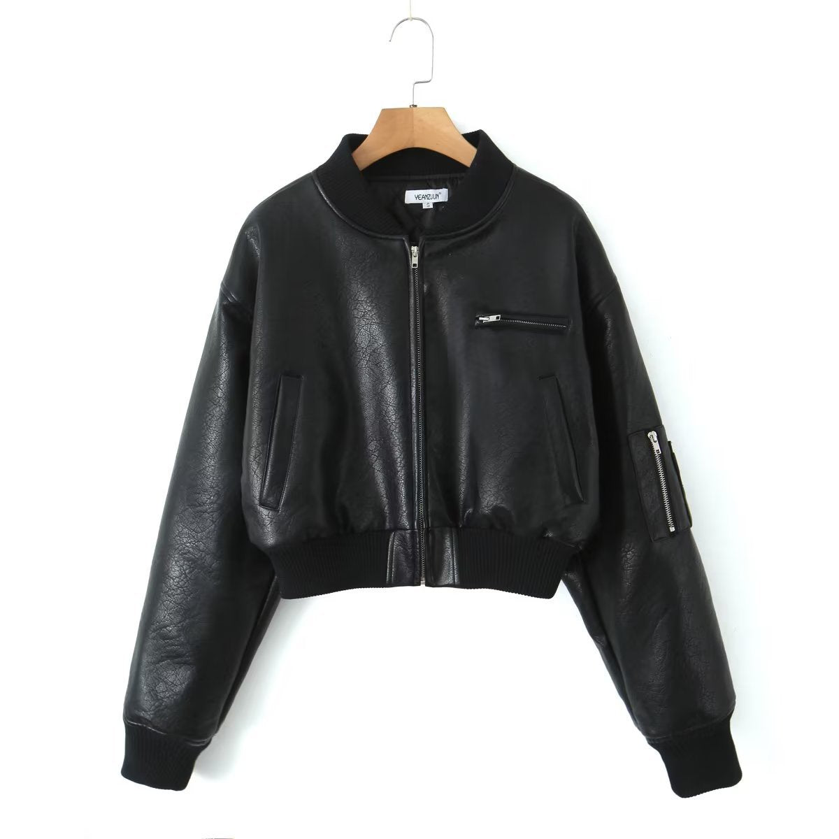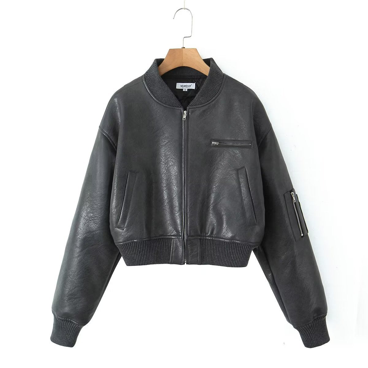 Retro Faux Leather Cotton Jacket Coat for Women Autumn Winter Sexy Stand Collar Zipper Short Varsity Jacket