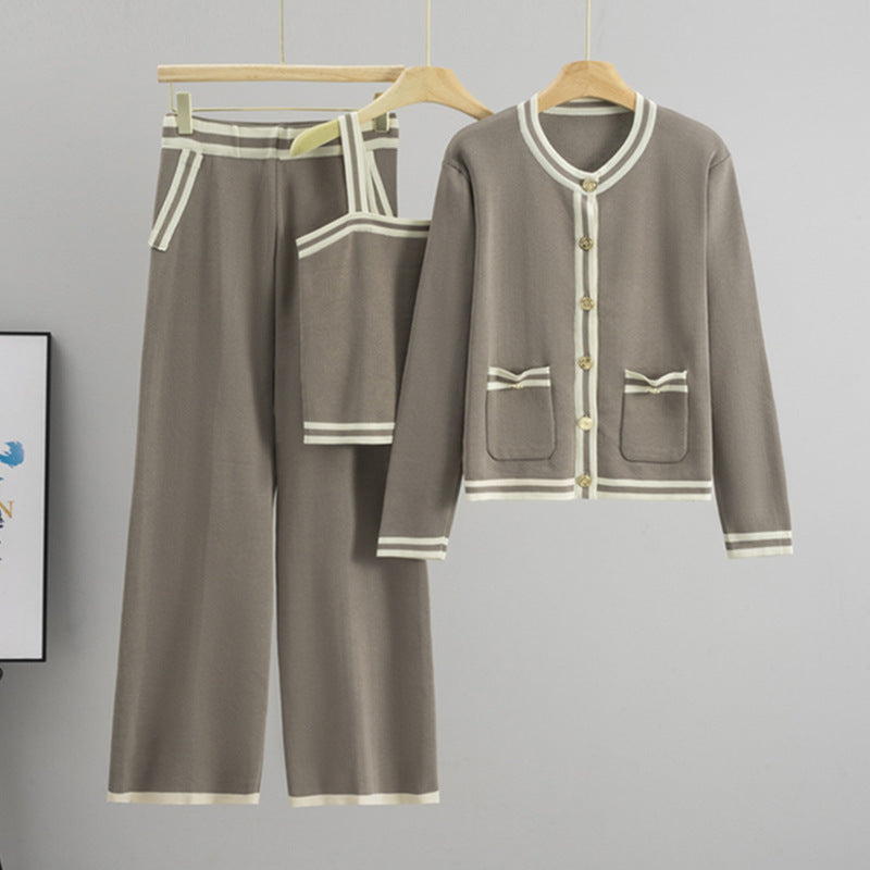 Round Neck Long Sleeve Knitted Cardigan Coat Straight Leg Trousers Vest Three Piece Trousers Set