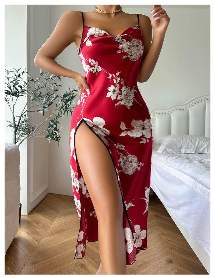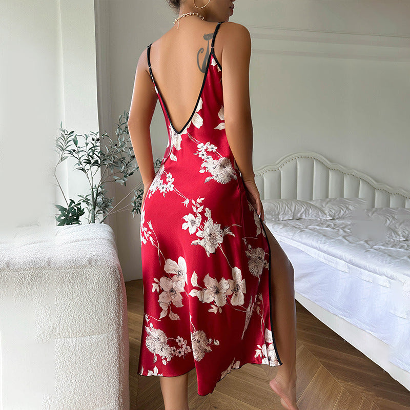 Sexy Print Suspender Summer Thin Breathable Imitated Silk Pajamas Women Backless Slit Slip Nightdress
