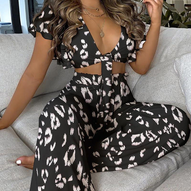 Sexy Ruffled Tied Top Casual Trousers Two Piece Set for Women