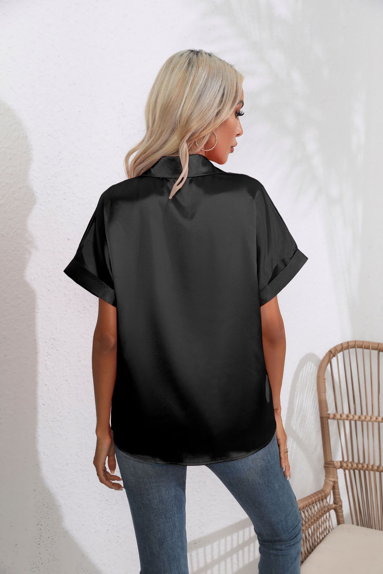 Shot Roll Sleeve Satin Shirt Women Satin Artificial Silk Short Sleeve Shirt Women Clothing