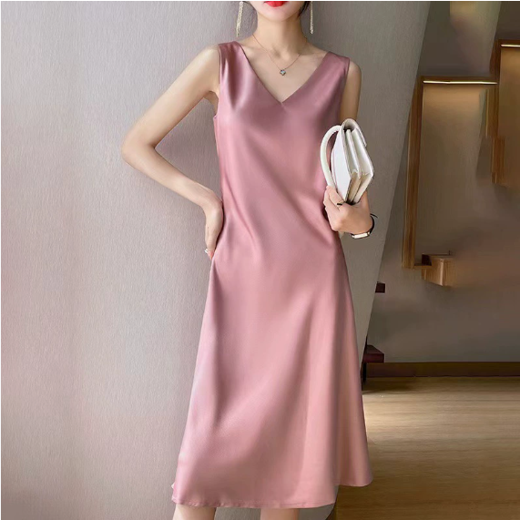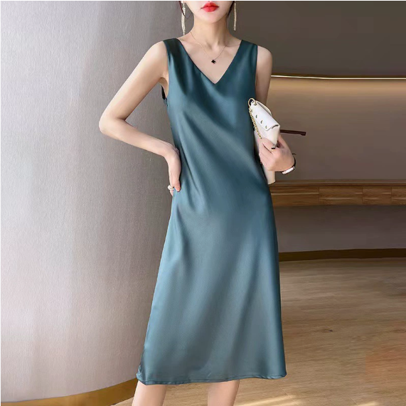Sleeveless Dress Women Satin Long below the Knee Summer Inner Wear plus Size Solid Color Halter Dress