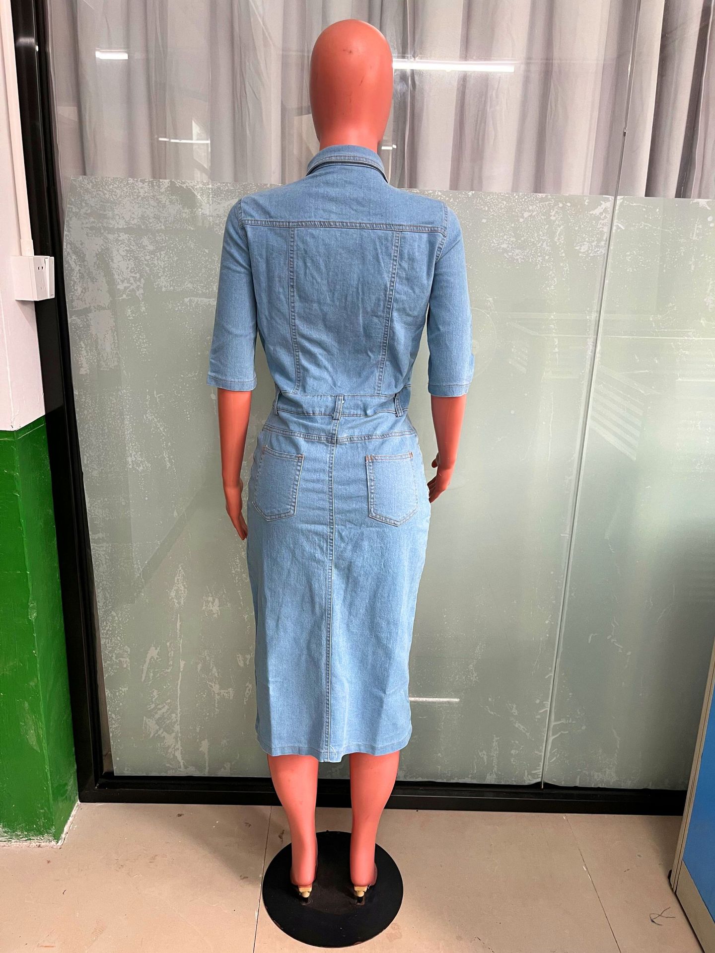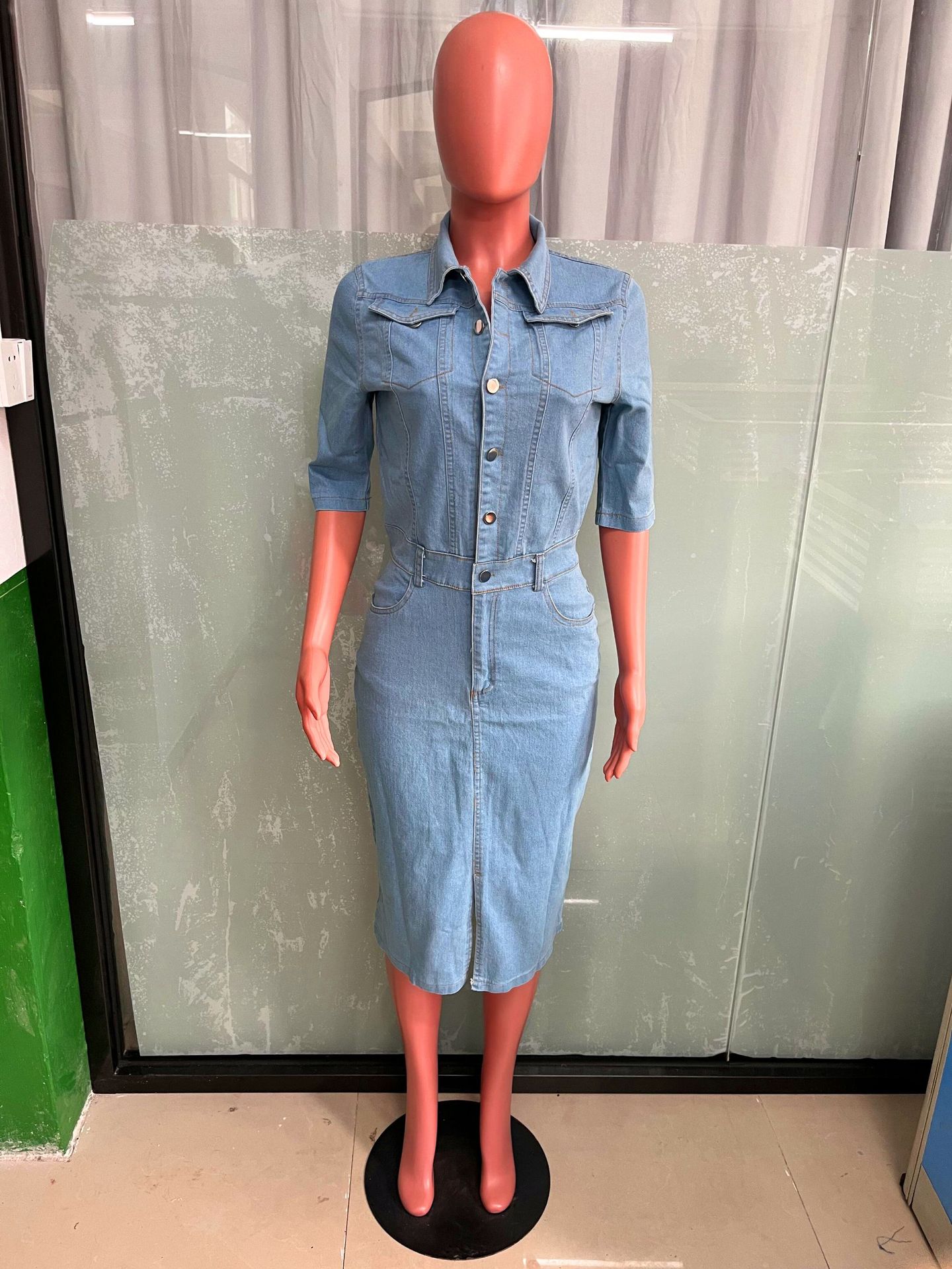 Slim Fit Stretch Sexy Elastic Breasted Denim Hip Wrapped Dress One Piece Midi Dress One Step Dress