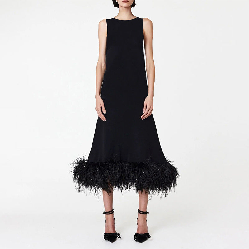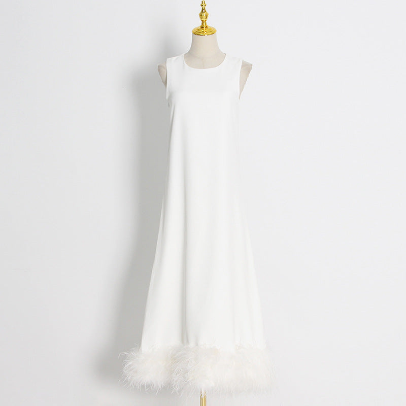 Solid Color Dress Autumn Crew Neck Sleeveless Loose Casual Hem Feather Dress