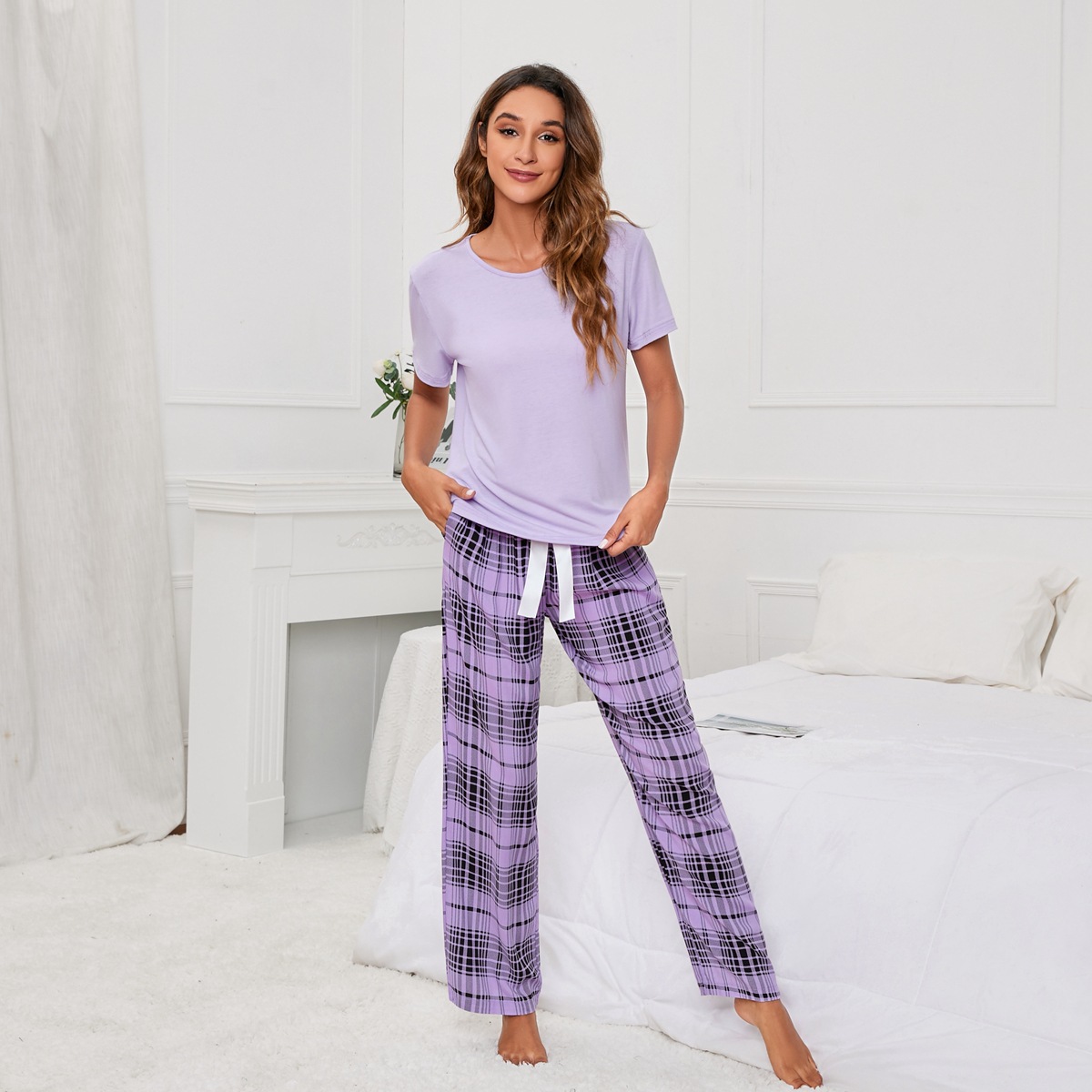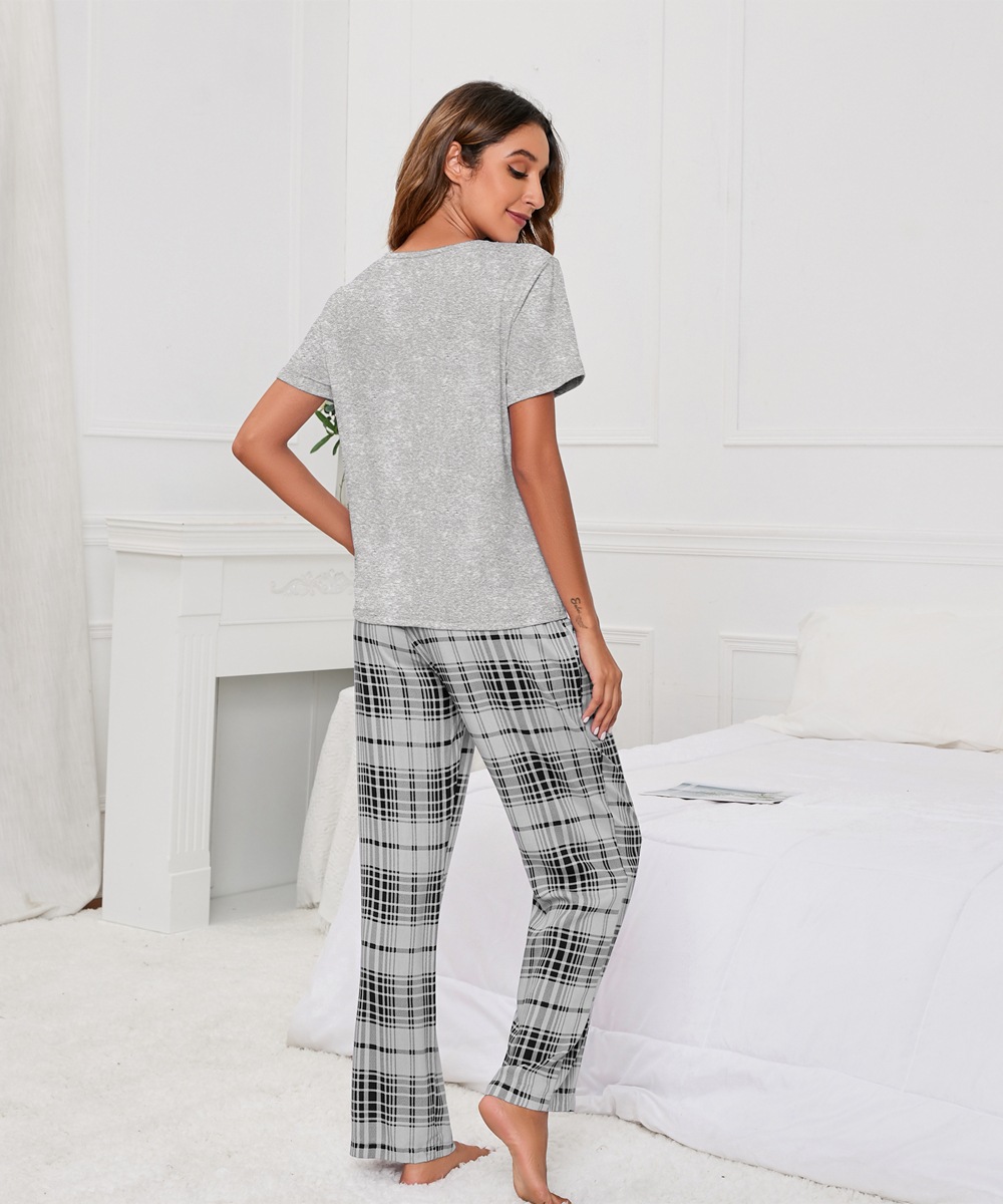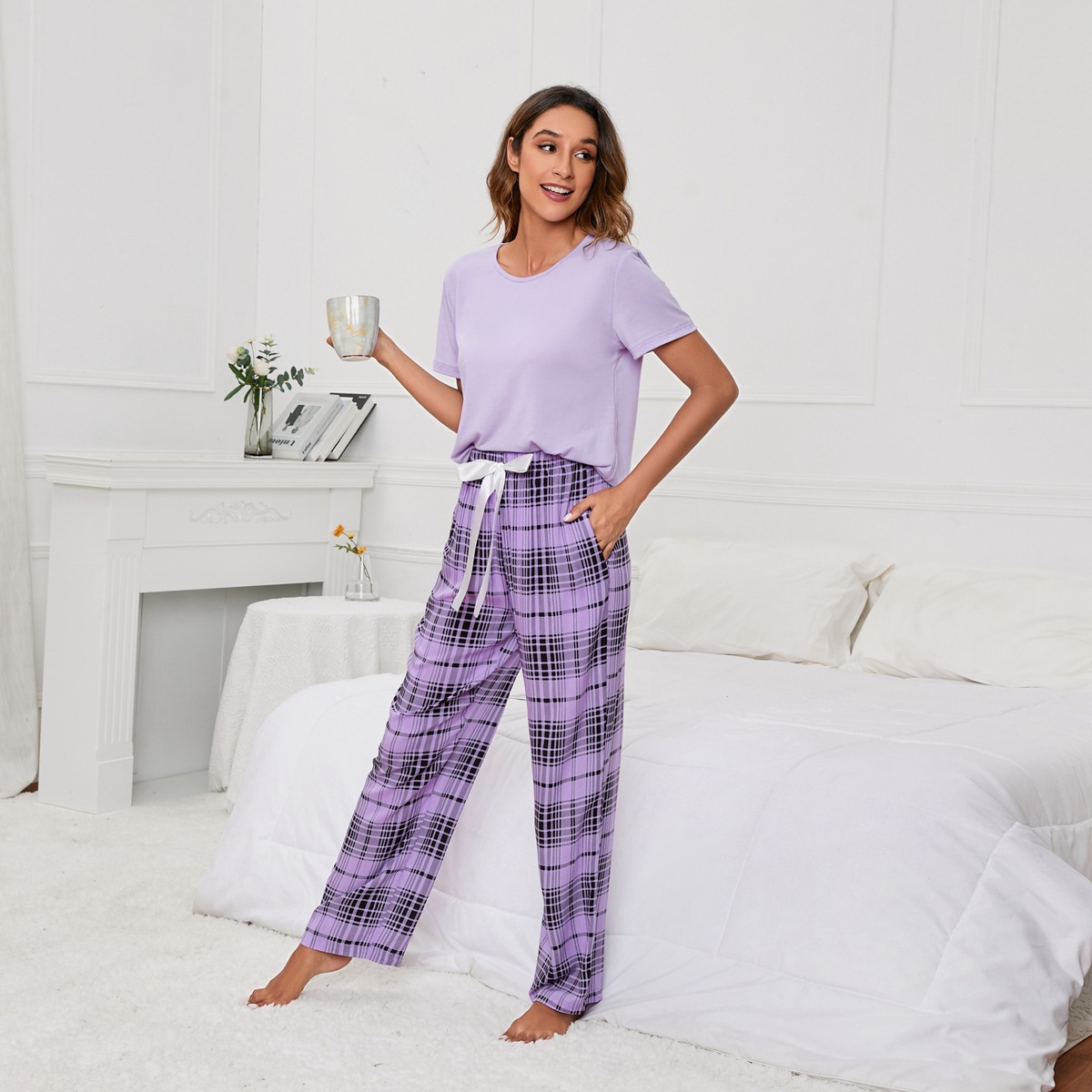 Solid Color round Neck T Printed Checks Women Casual Suit Homewear Pajamas Women