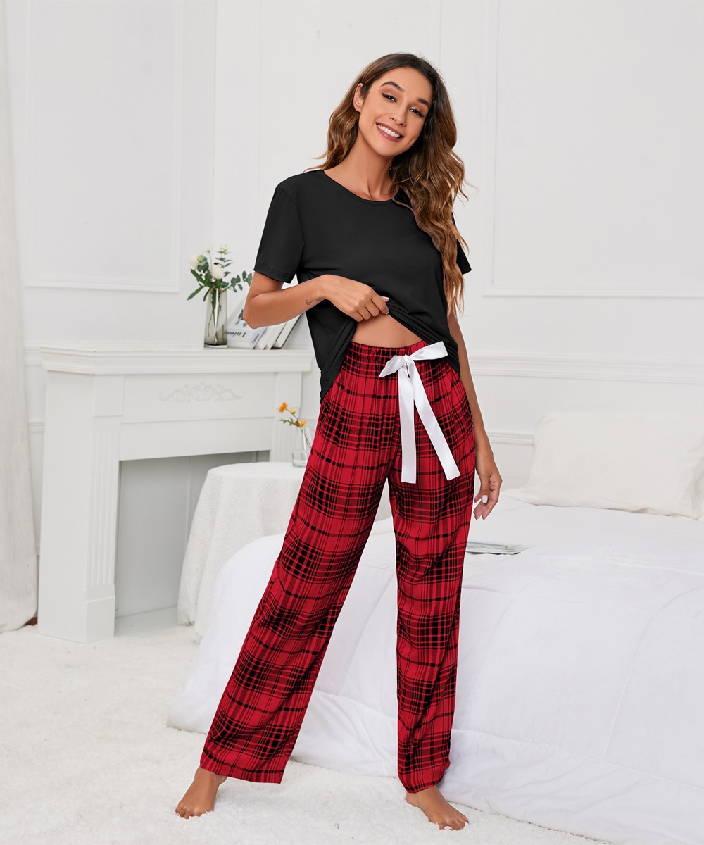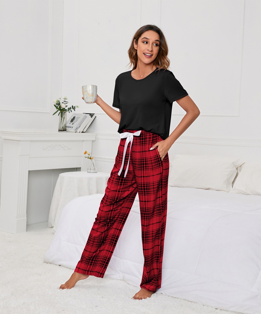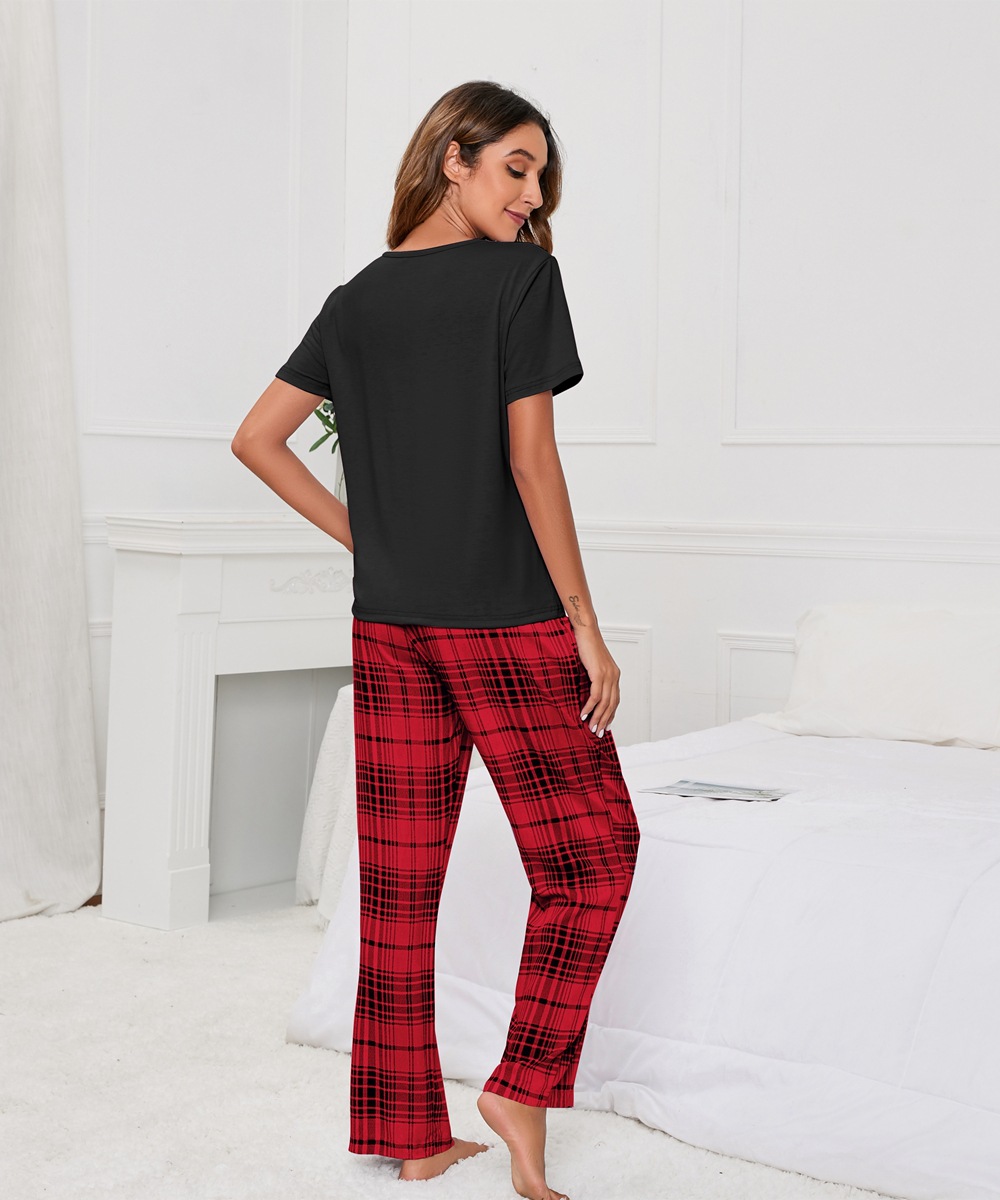 Solid Color round Neck T Printed Checks Women Casual Suit Homewear Pajamas Women