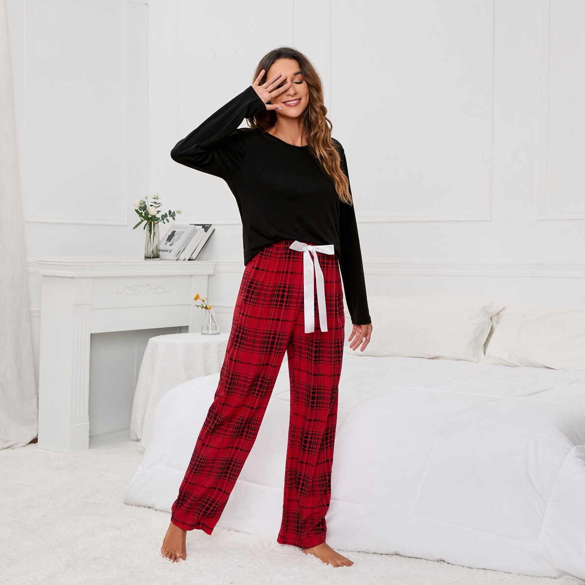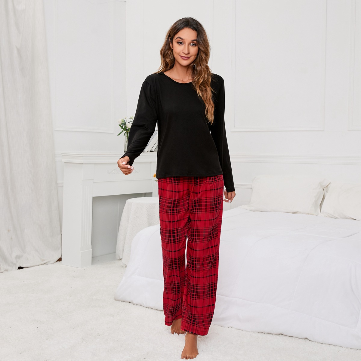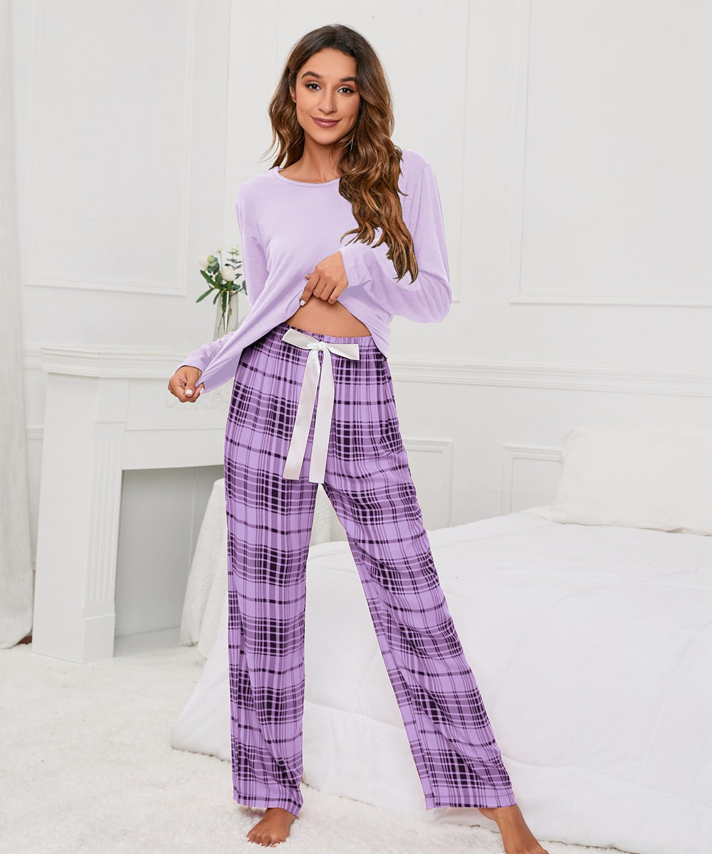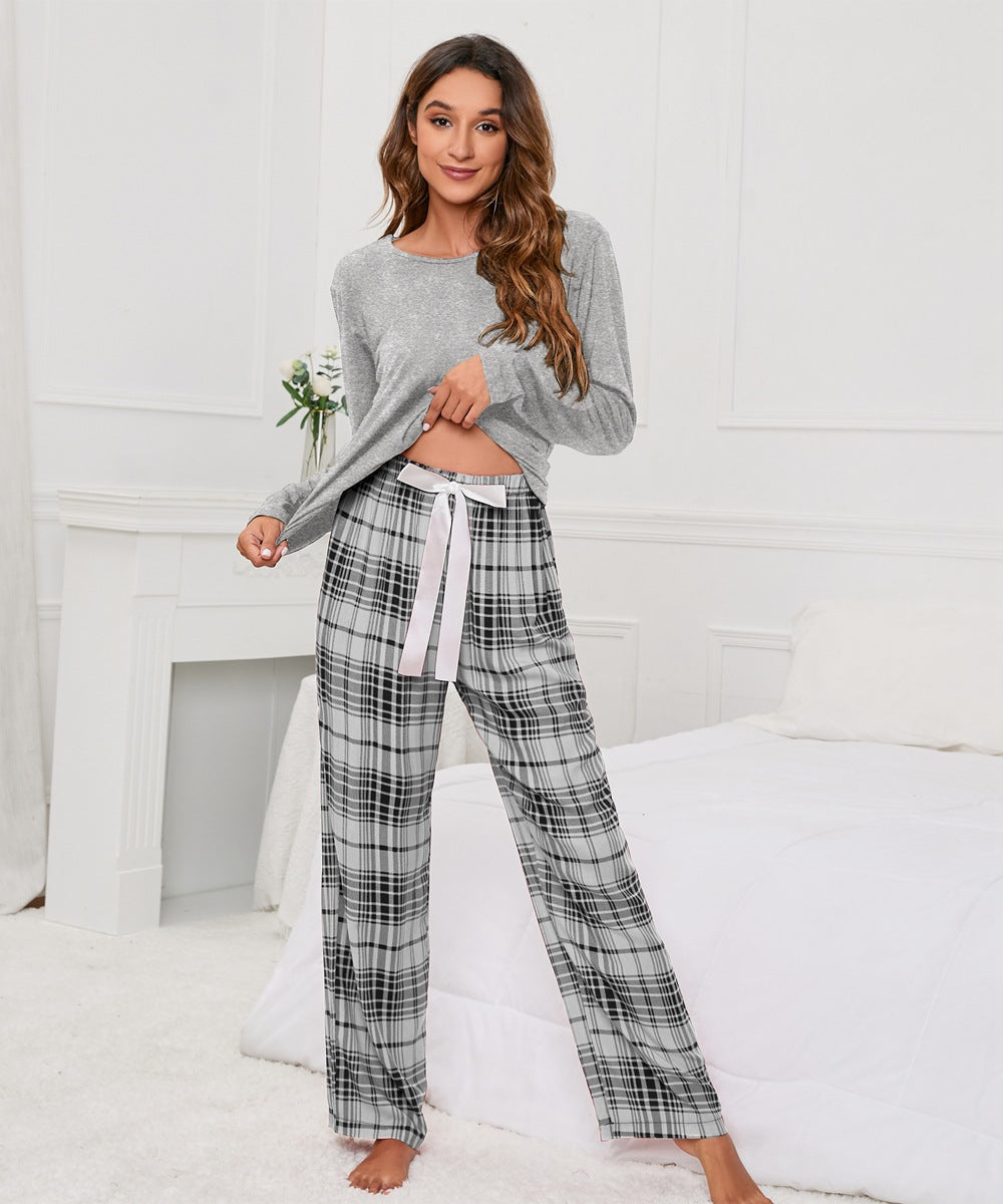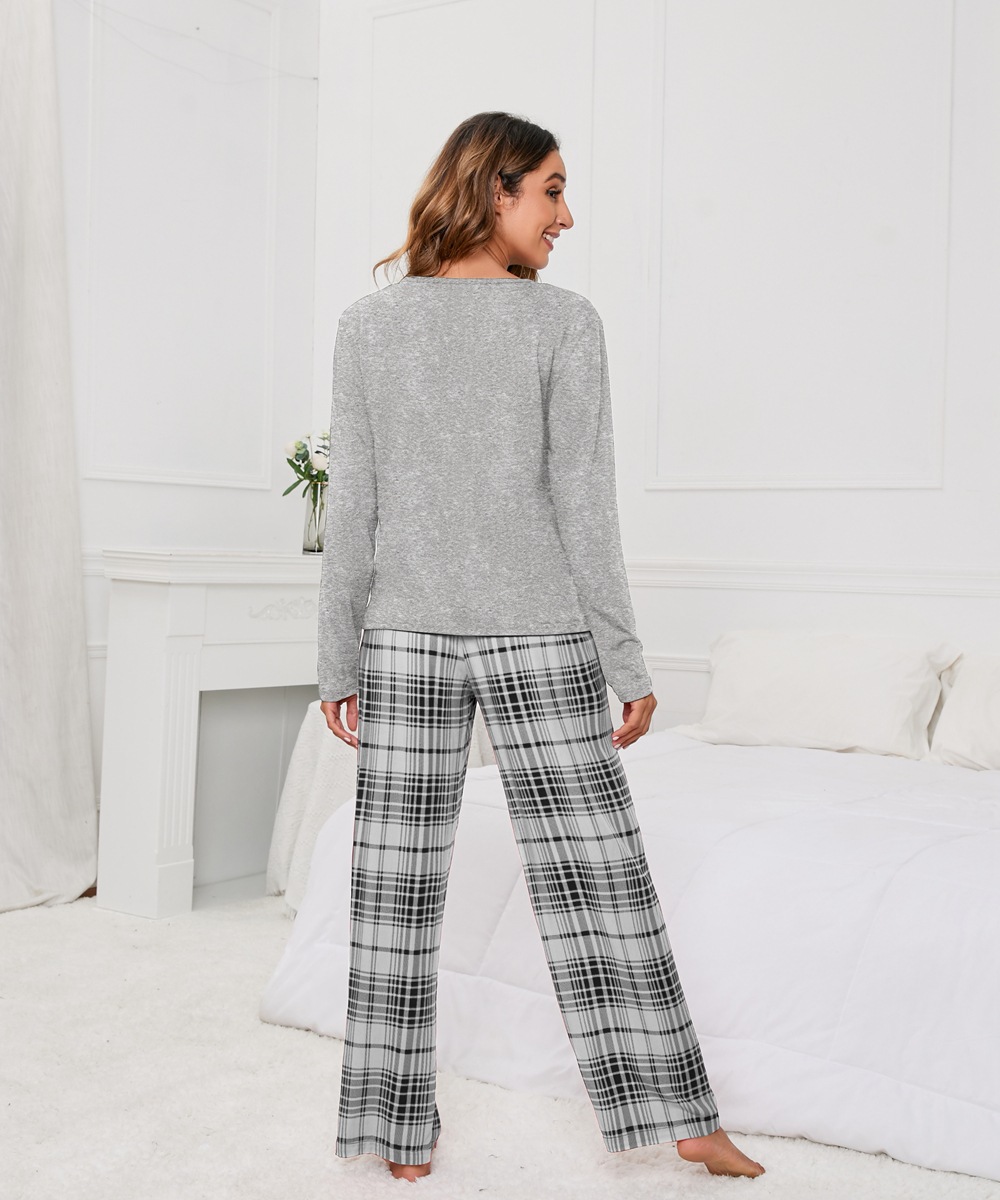 Solid Color round Neck T Printed Checks Women Casual Suit Homewear Pajamas Women