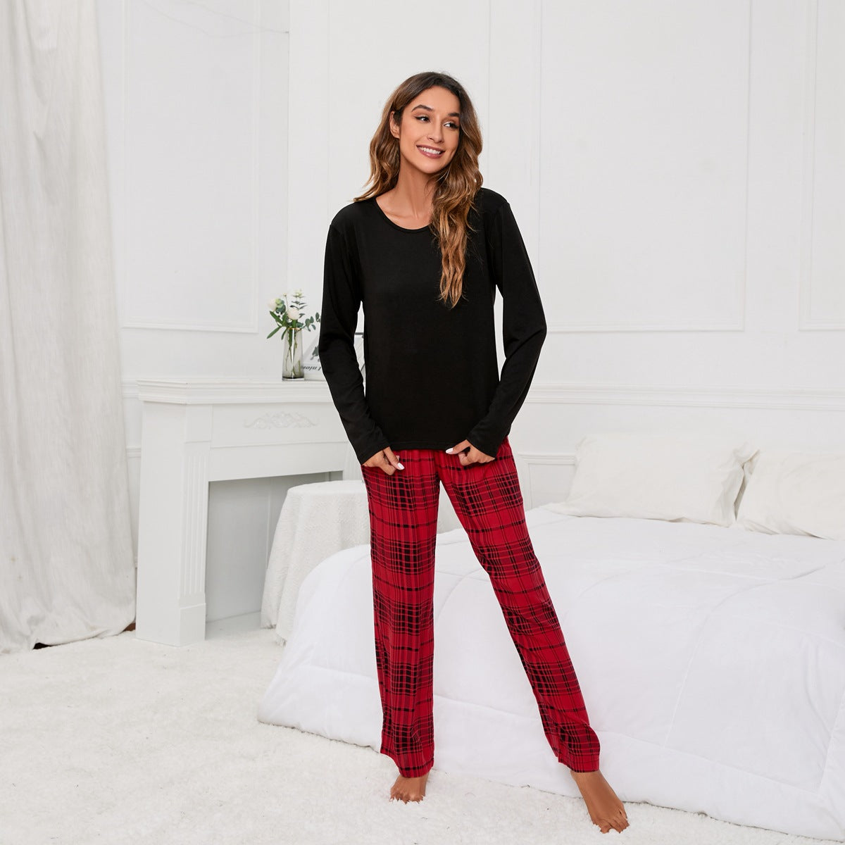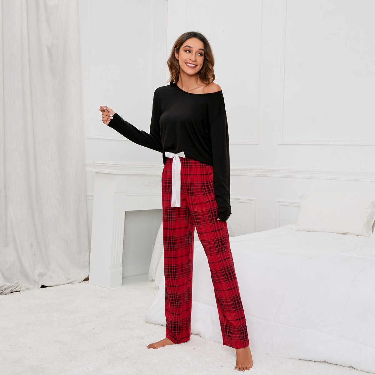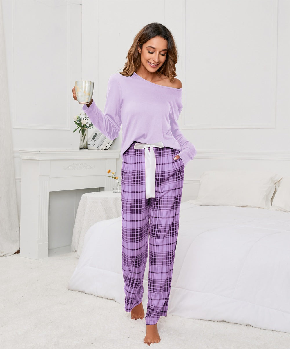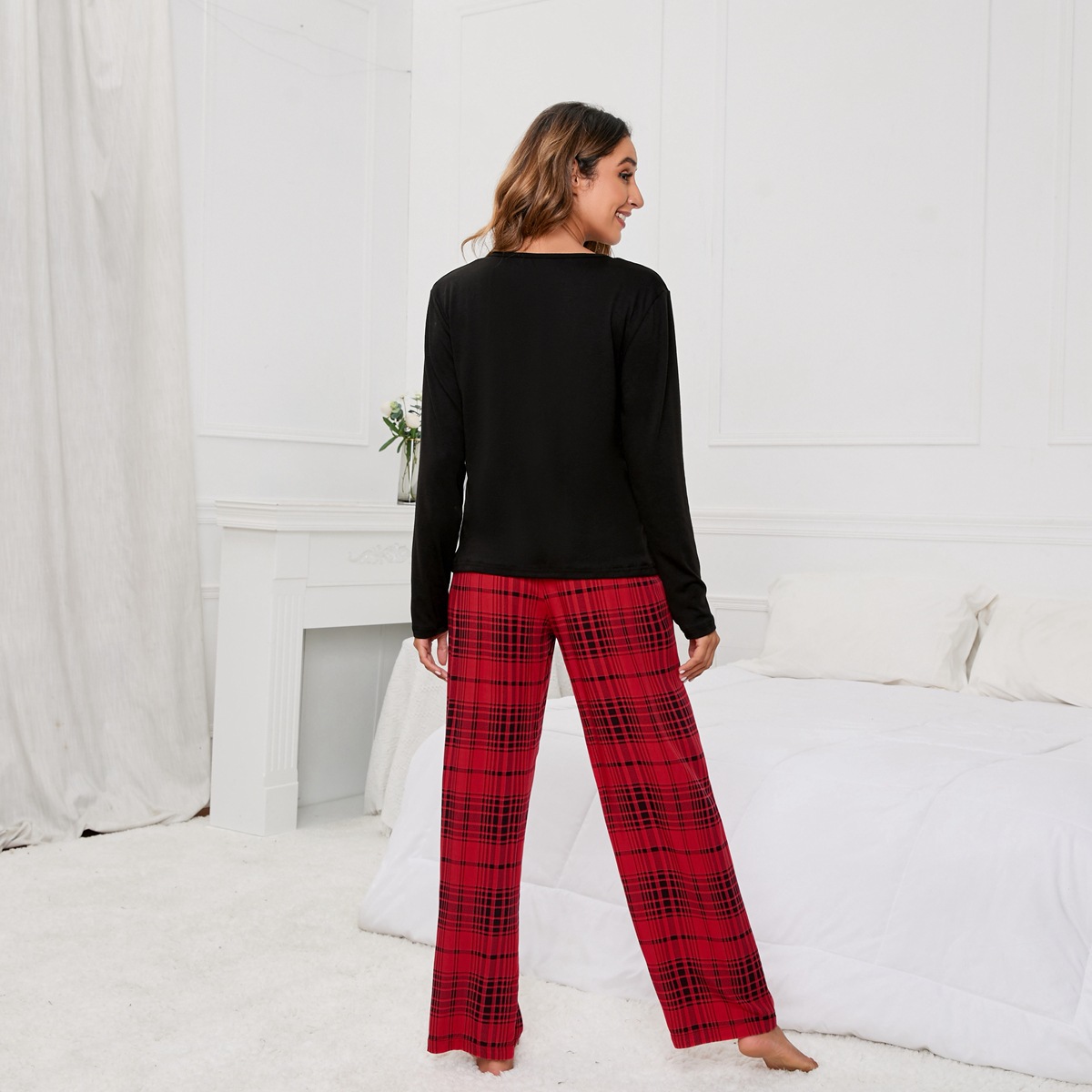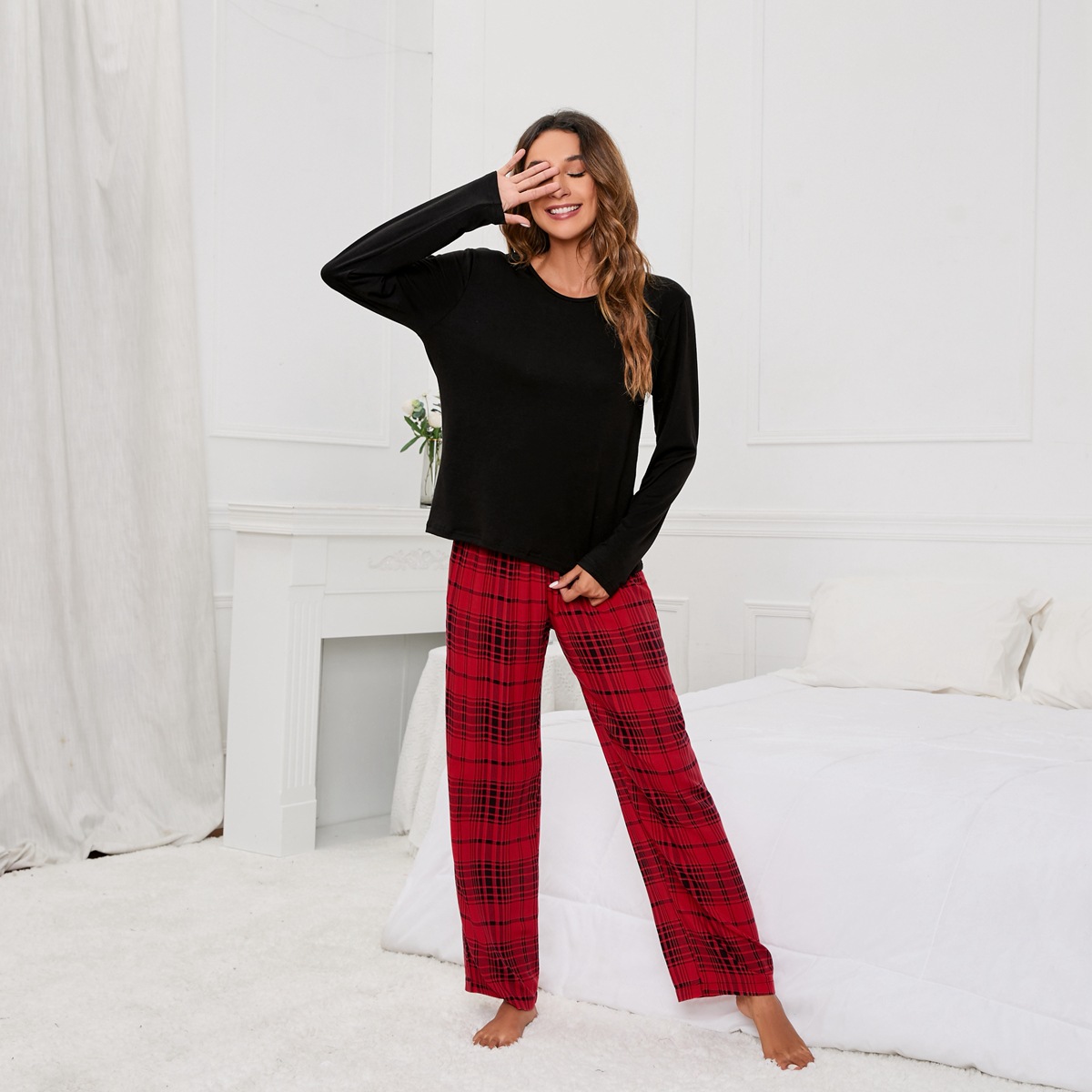 Solid Color round Neck T Printed Checks Women Casual Suit Homewear Pajamas Women