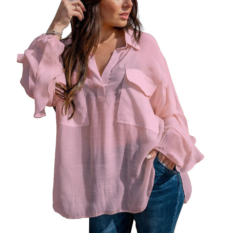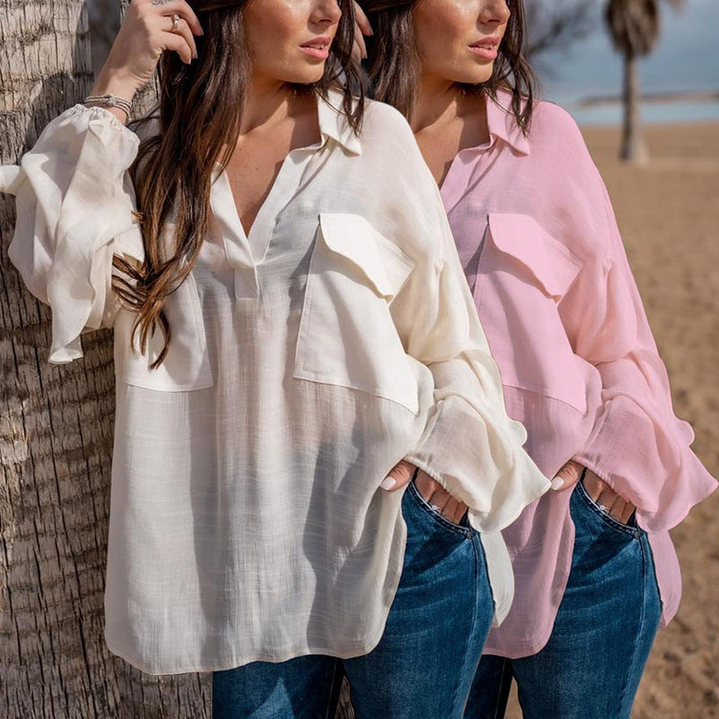 Spot Women Clothing Summer Personal Casual Long Sleeve Pullover Solid Color Cotton Linen Blouse