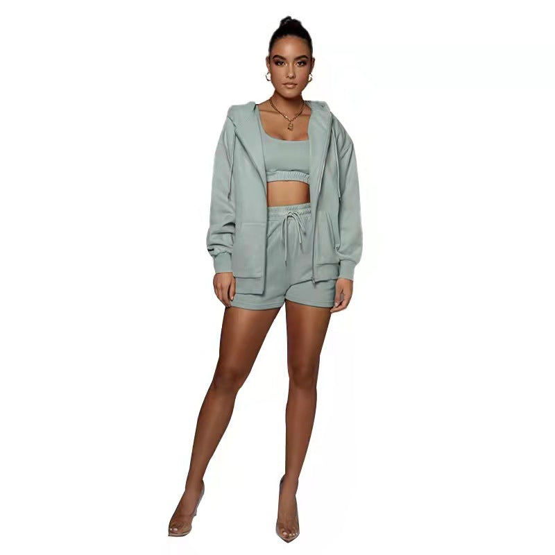 Spring Autumn Urban Casual Solid Color Cardigan Hooded Shorts Women Velvet Long Sleeve Sweatshirt Suit Two Piece Set