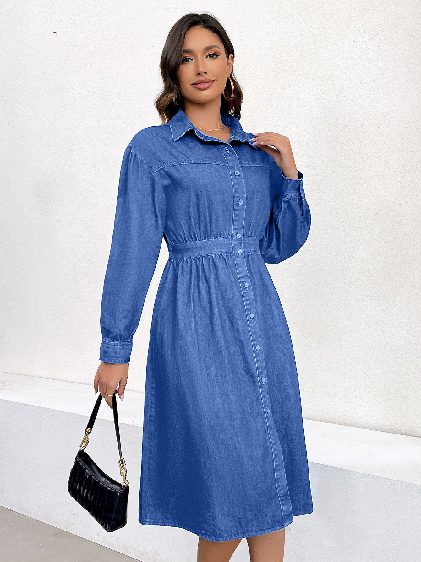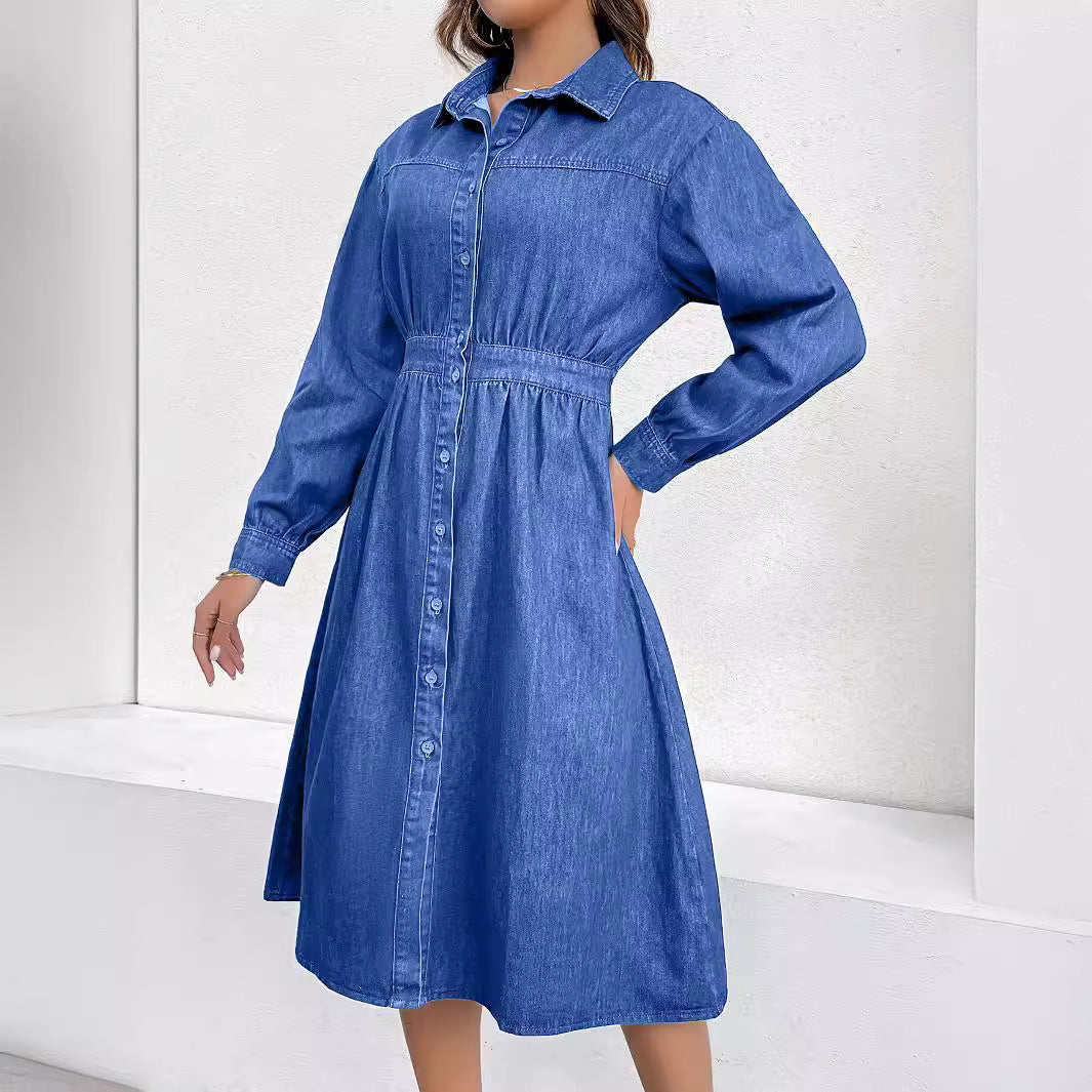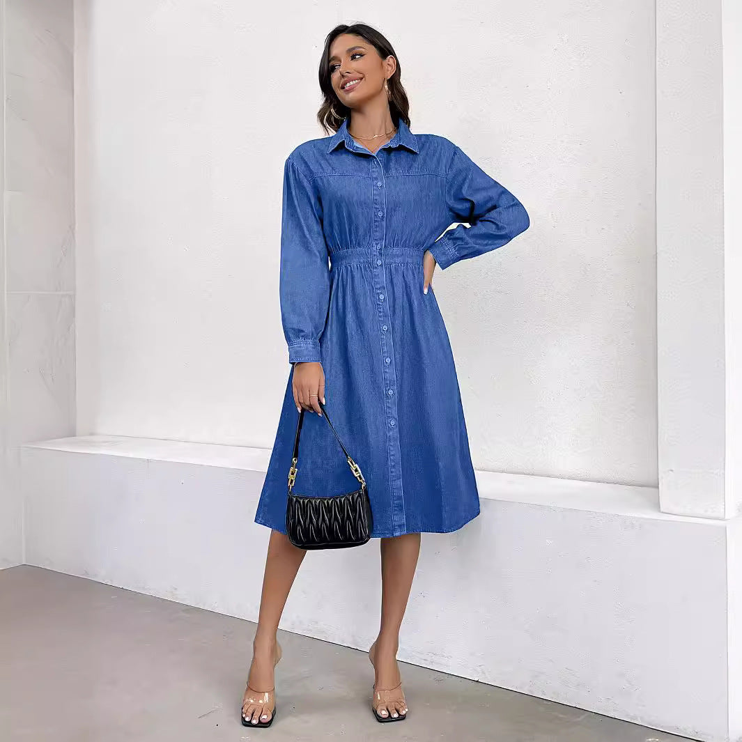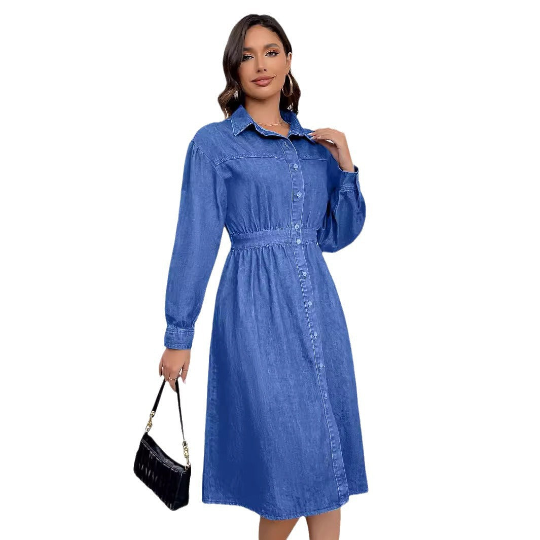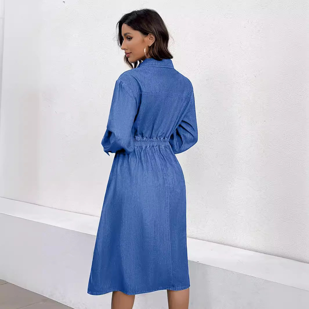 Spring Denim Dress Front Single Breasted V Neck Tight Waist Slimming Denim Dress Women