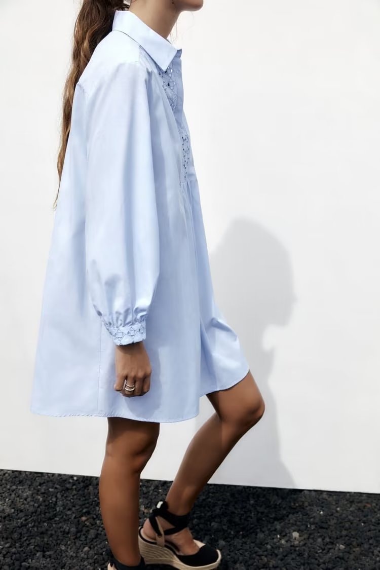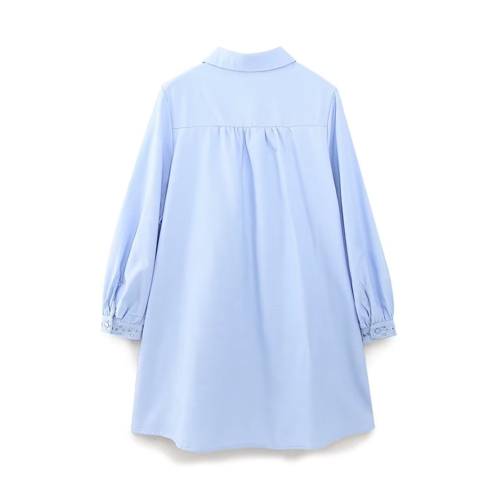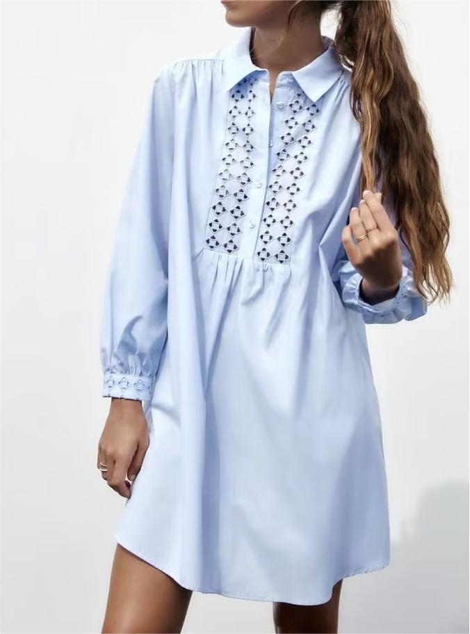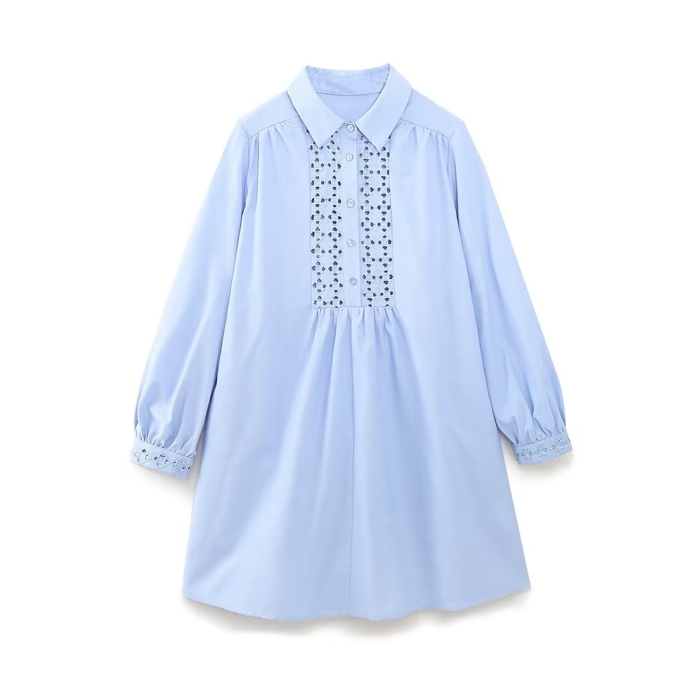 Spring Retro Loose Long Sleeve Decorated Row Button Hollow Out Cutout Embroidered Mini Dress