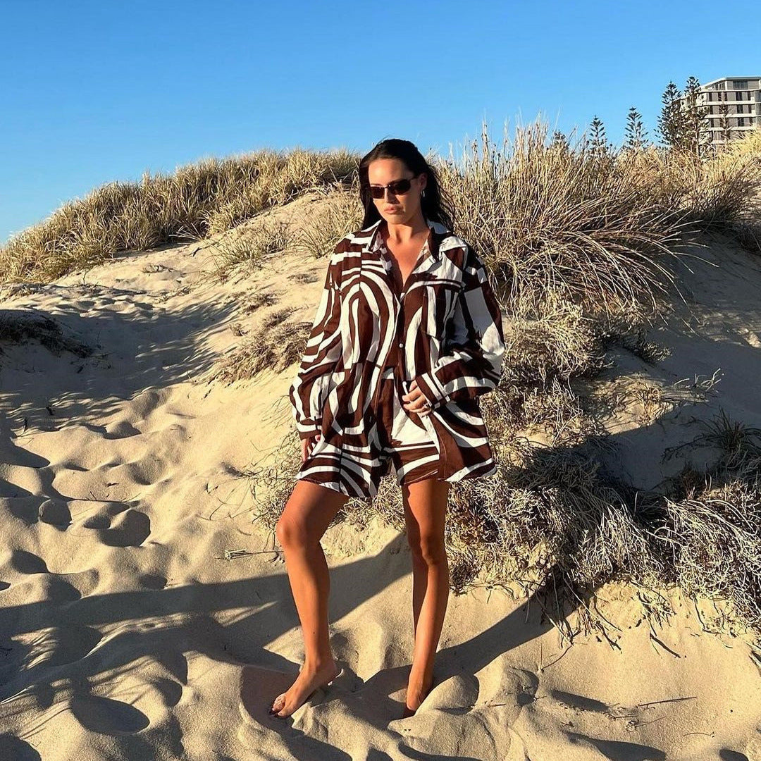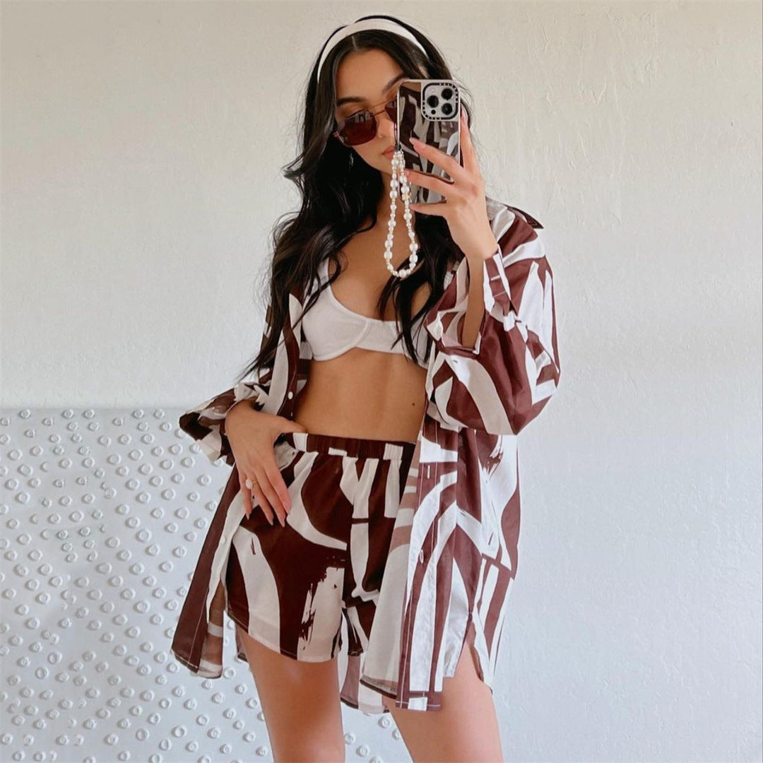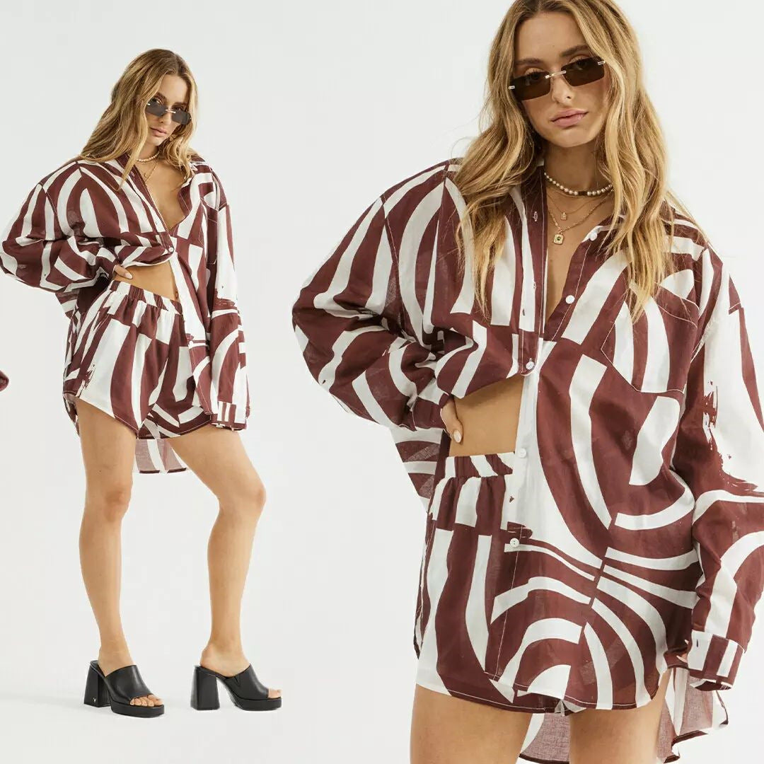 Spring Summer Beach Casual Suit Women Loose Collared Long Sleeves Shirt Shorts Two Piece Women Clothing