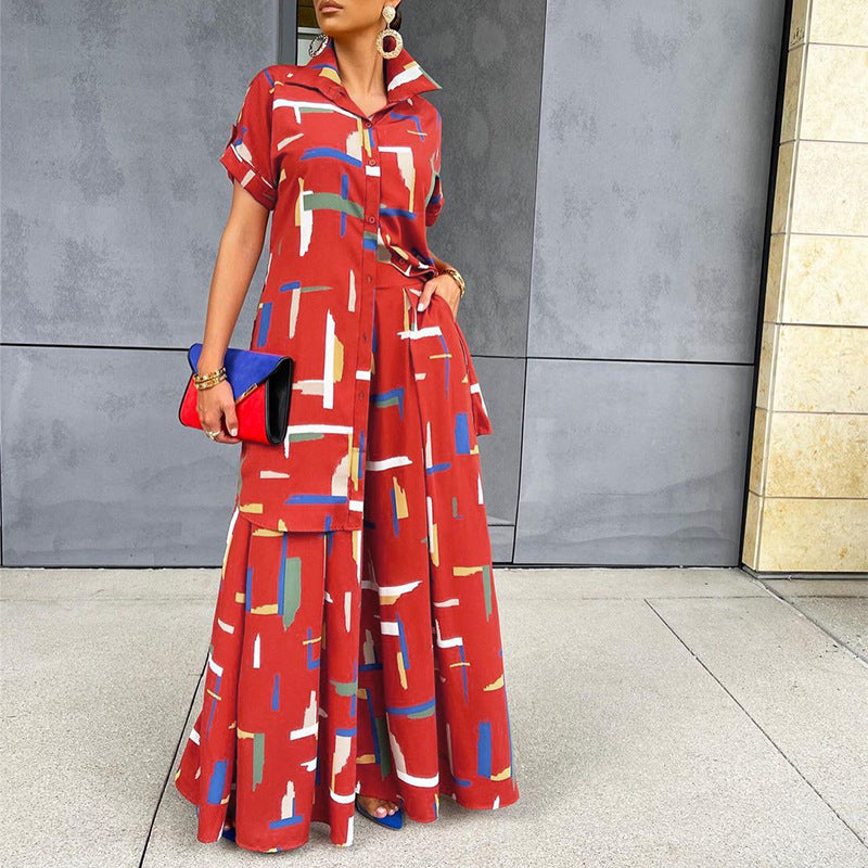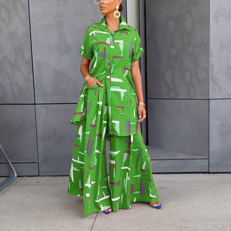 Spring Summer Black Women Casual Shirt Loose Trousers Printed Two Piece Set