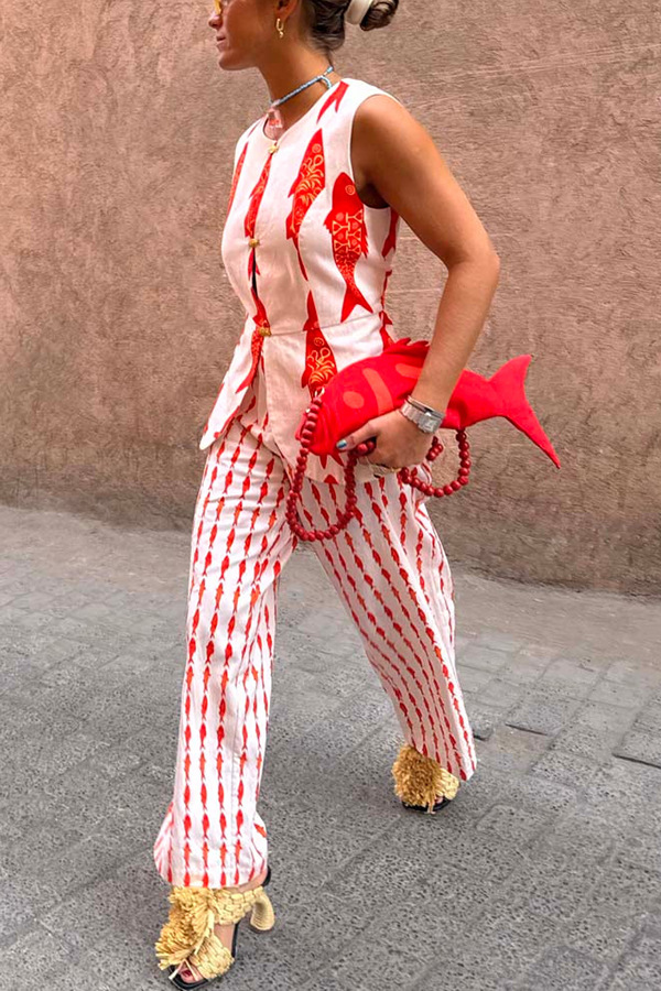 Spring Summer Vest Pants Printing Vacation Loose Elastic Waist Two Piece Set